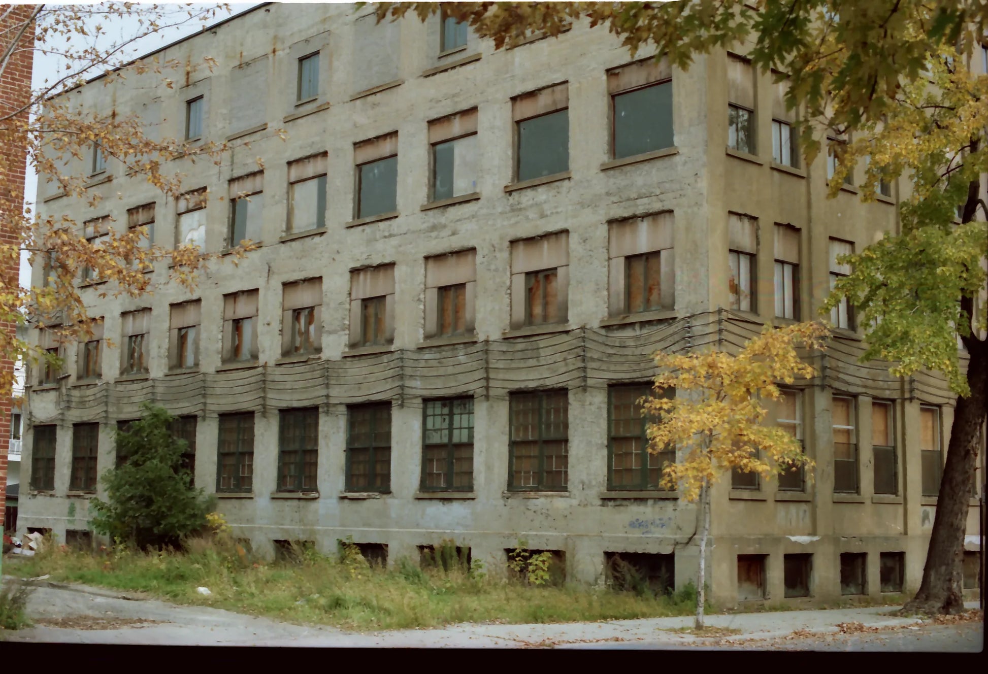 Vue de la rue Desjardins de l'ancienne manufacture Dufresne & Locke, barricadée. Située coin Desjardins et Ontario. Sera remplacée par le CLSC Maisonneuve