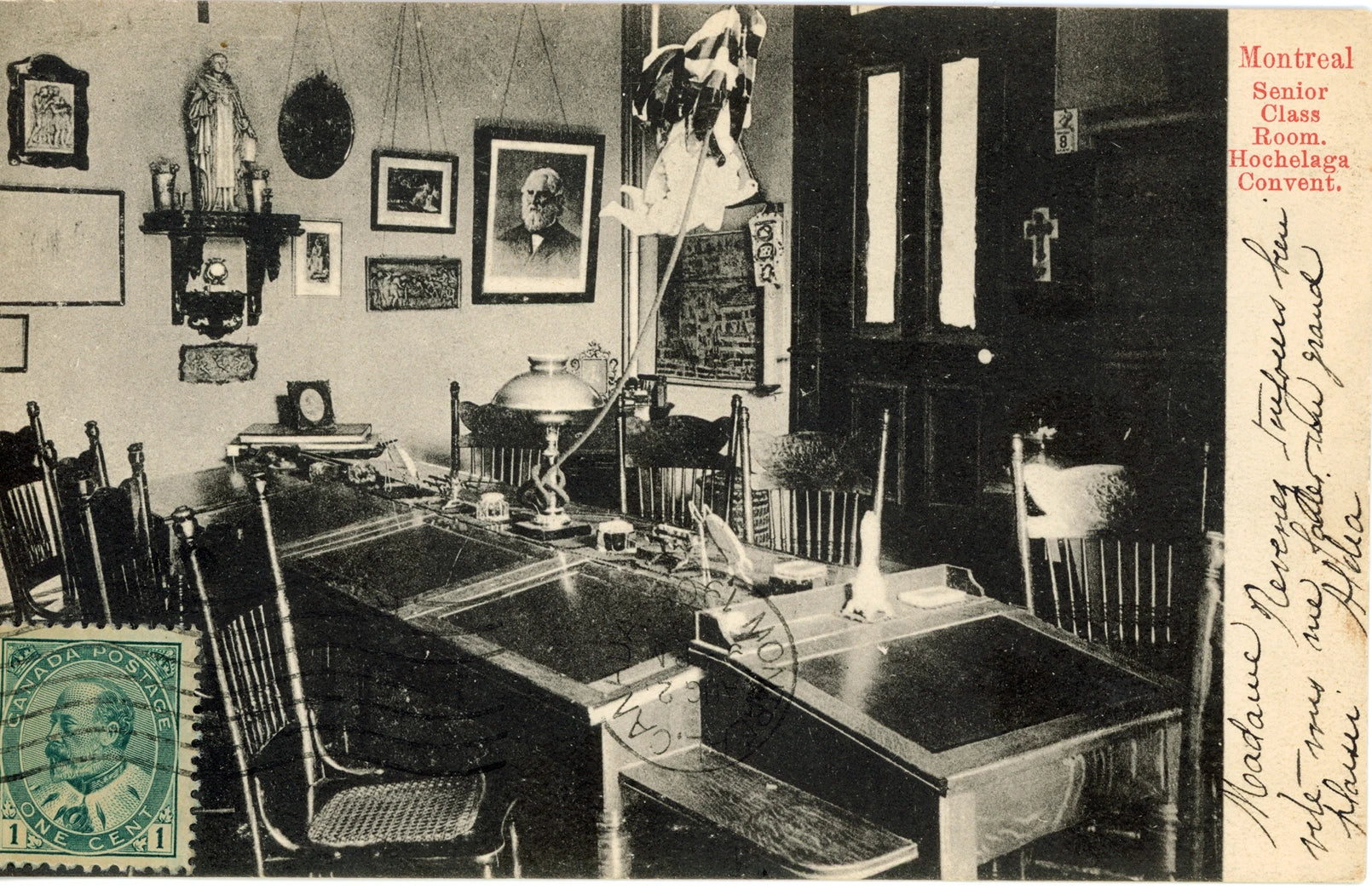 Carte postale représentant l'intérieur d'une classe au couvent Hochelaga. Une note manuscrite y est ajoutée: "Madame, revenez toujours bien vite car vous me faites un grand plaisir. Aldea."