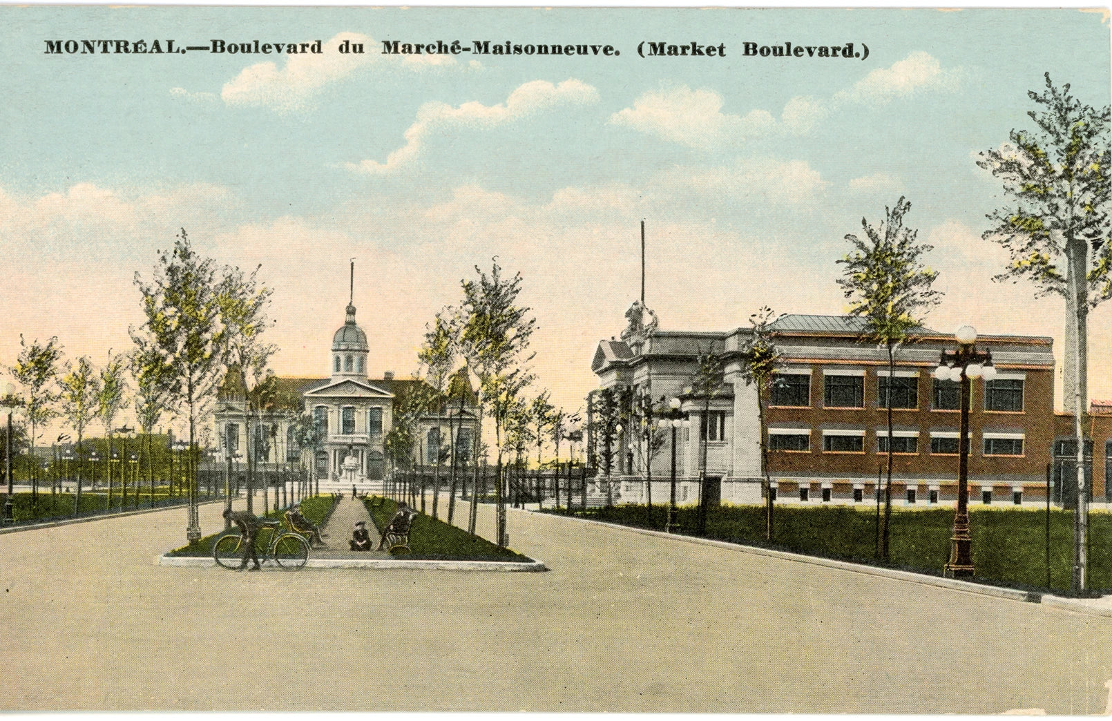 Carte postale du boulevard du Marché-Maisonneuve (boul. Morgan) vu depuis la rue la Fontaine en direction Nord. En face le marché Maisonneuve. À droite, le bain Morgan.