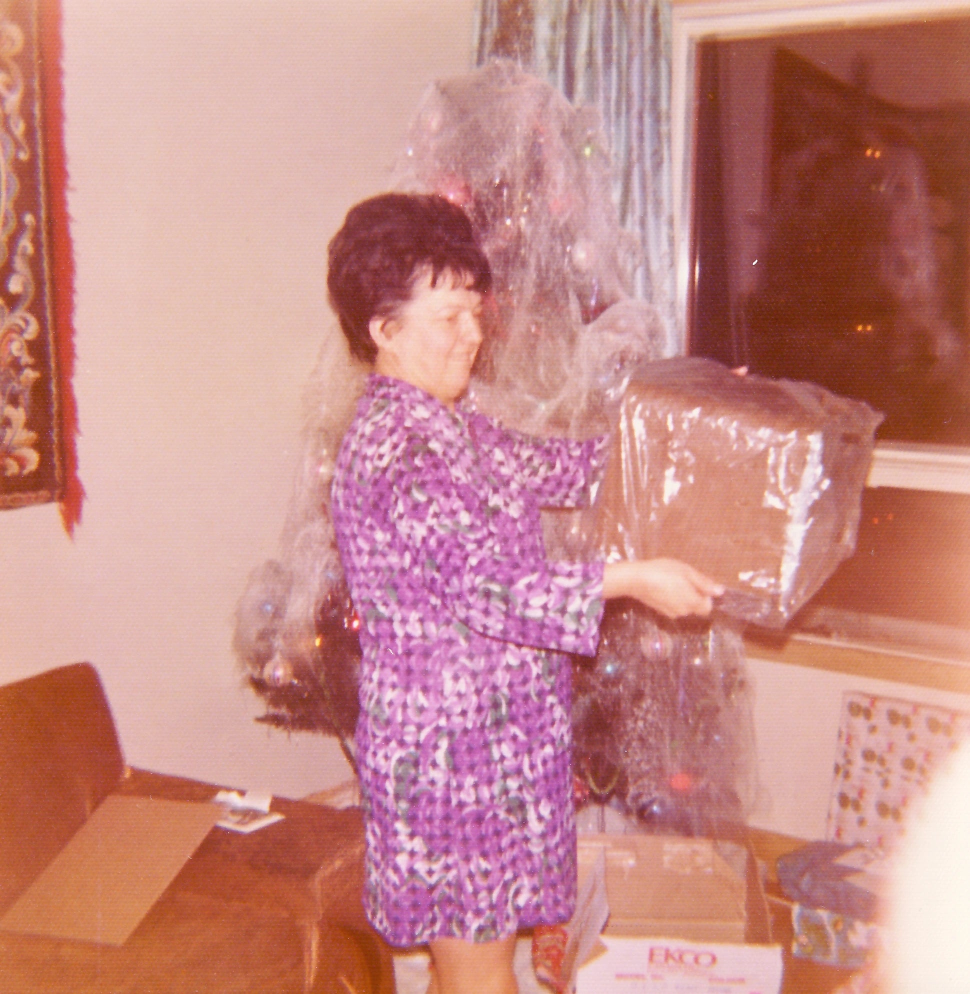Jacqueline Turcotte Demers dans un salon à Noël, déballant un cadeau.