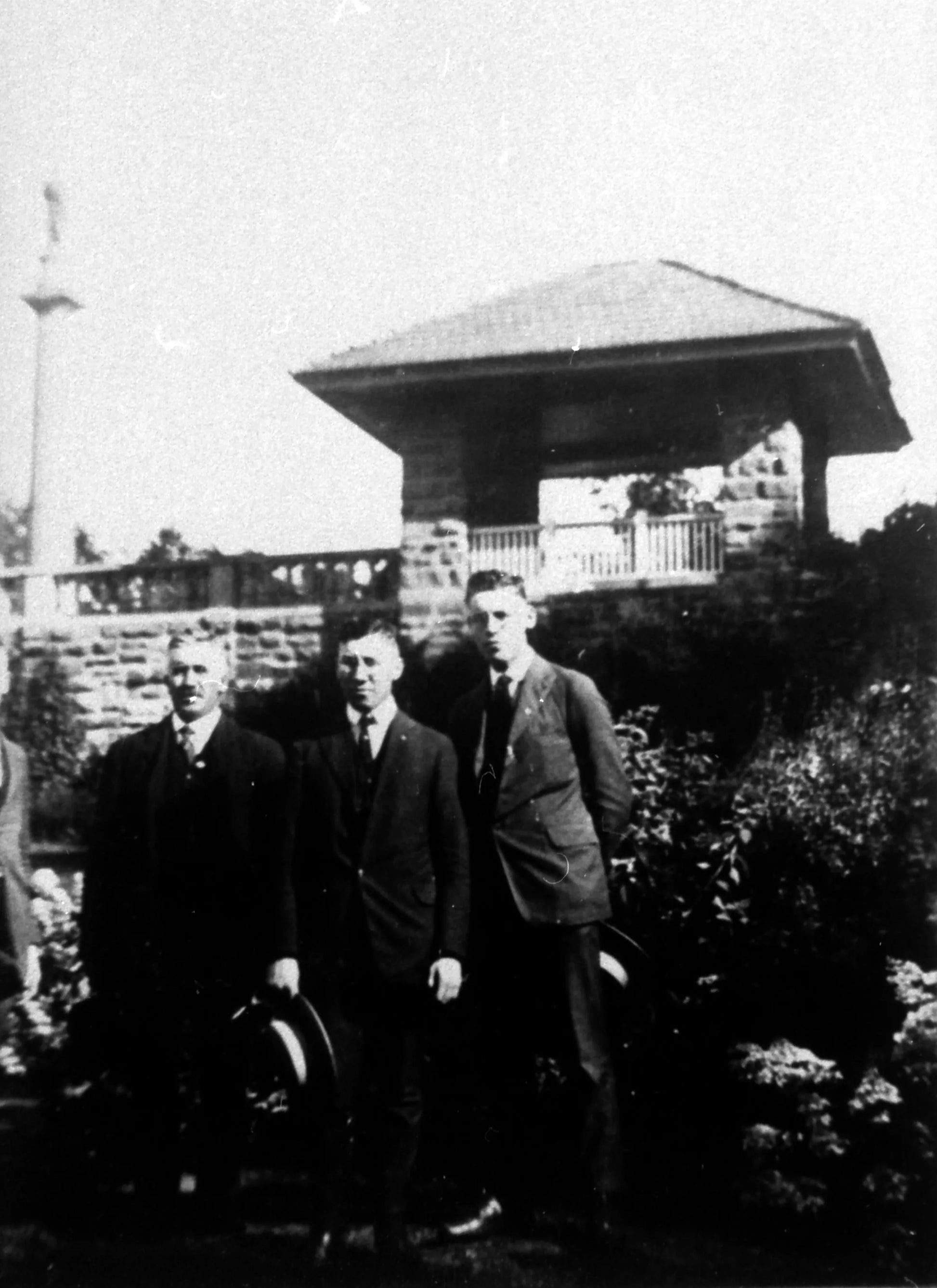 Arthur Sicard et deux de ses fils, Hervé et Wilfrid, devant un mur de pierre avec un pavillon.