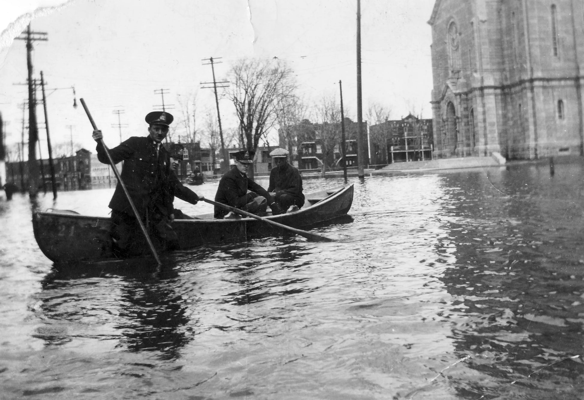 Inondation sur la rue Notre-Dame à Longue-Pointe près de l'église St-François d'Assise.