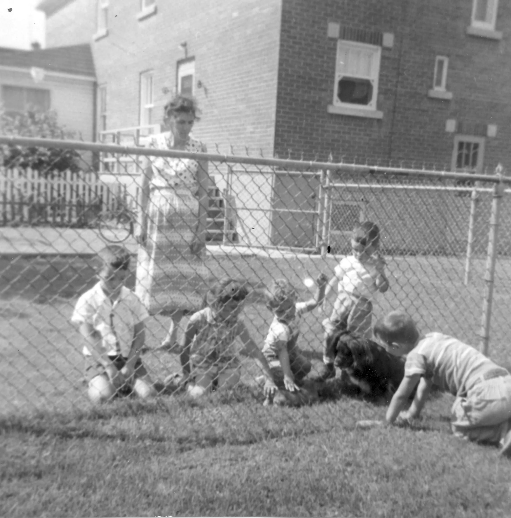 Cinq enfants jouent dans les cours des 1100 et 1024 rue de Bruxelles sous la supervision d'une femme.