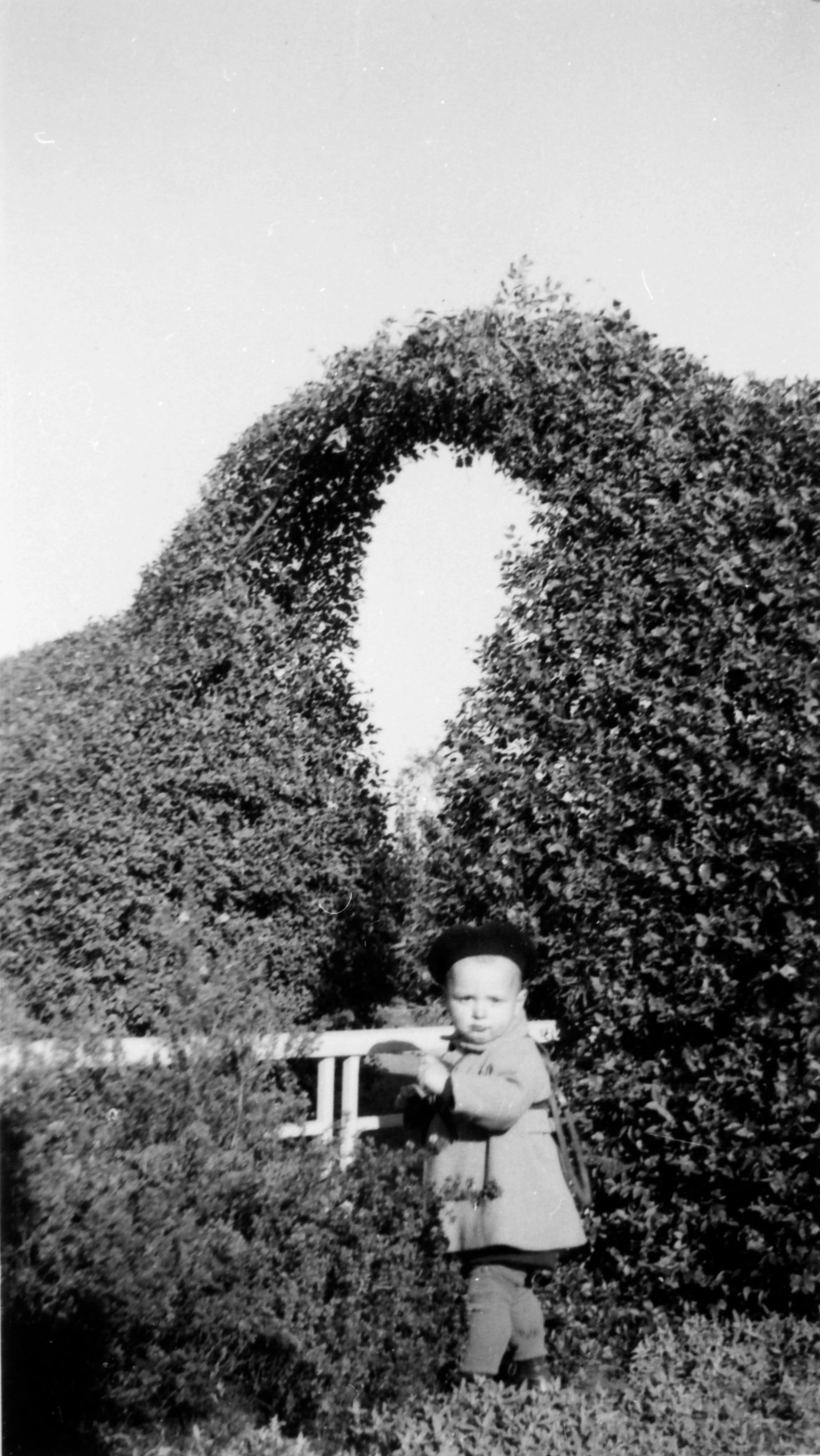Le petit Claude Côté (20 mois), debout devant une haie du Jardin botanique. 1943.