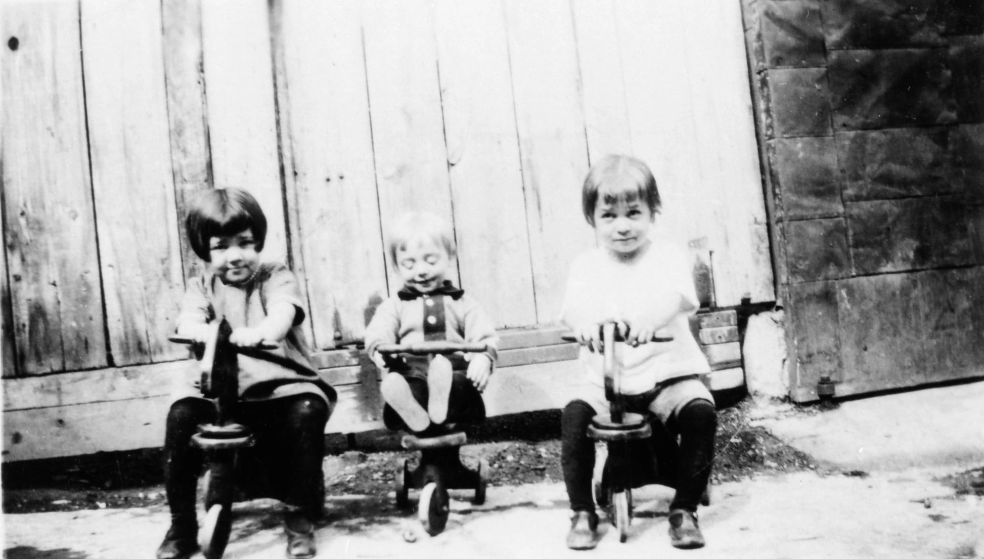 Trois enfants de la famille Côté (Lucie, André et Gustave) assis à l'extérieur sur de petits chevaux de bois, 1926.