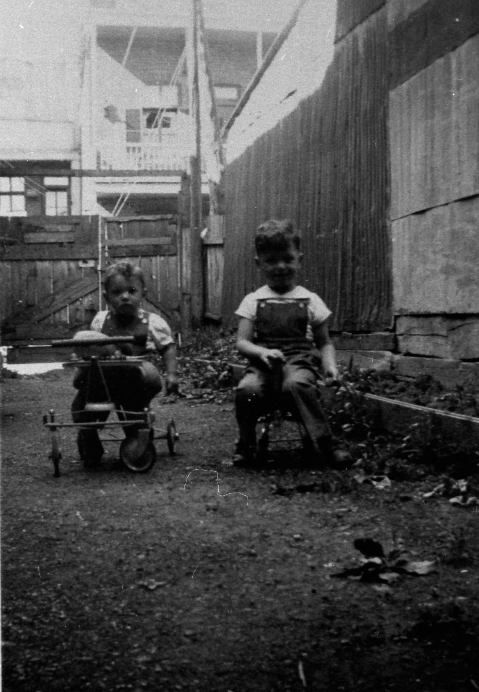 Les jeunes Gilles et Claude Sammut assis sur leur petits quadricycles, dans la cour arrière chez leur grand-mère. 1946.