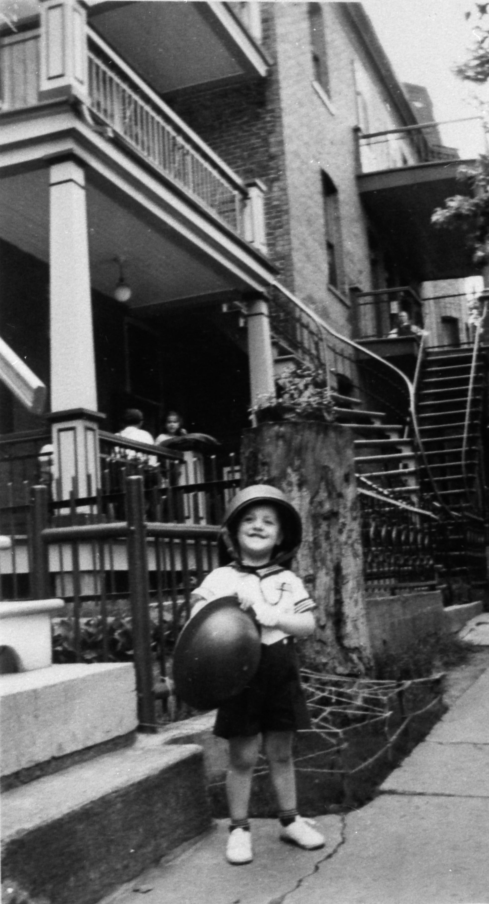 Le jeune Claude Sammut avec un chapeau de soldat sur la tête et un autre dans les mains, devant le 1710 de la rue Orléans. 1944.