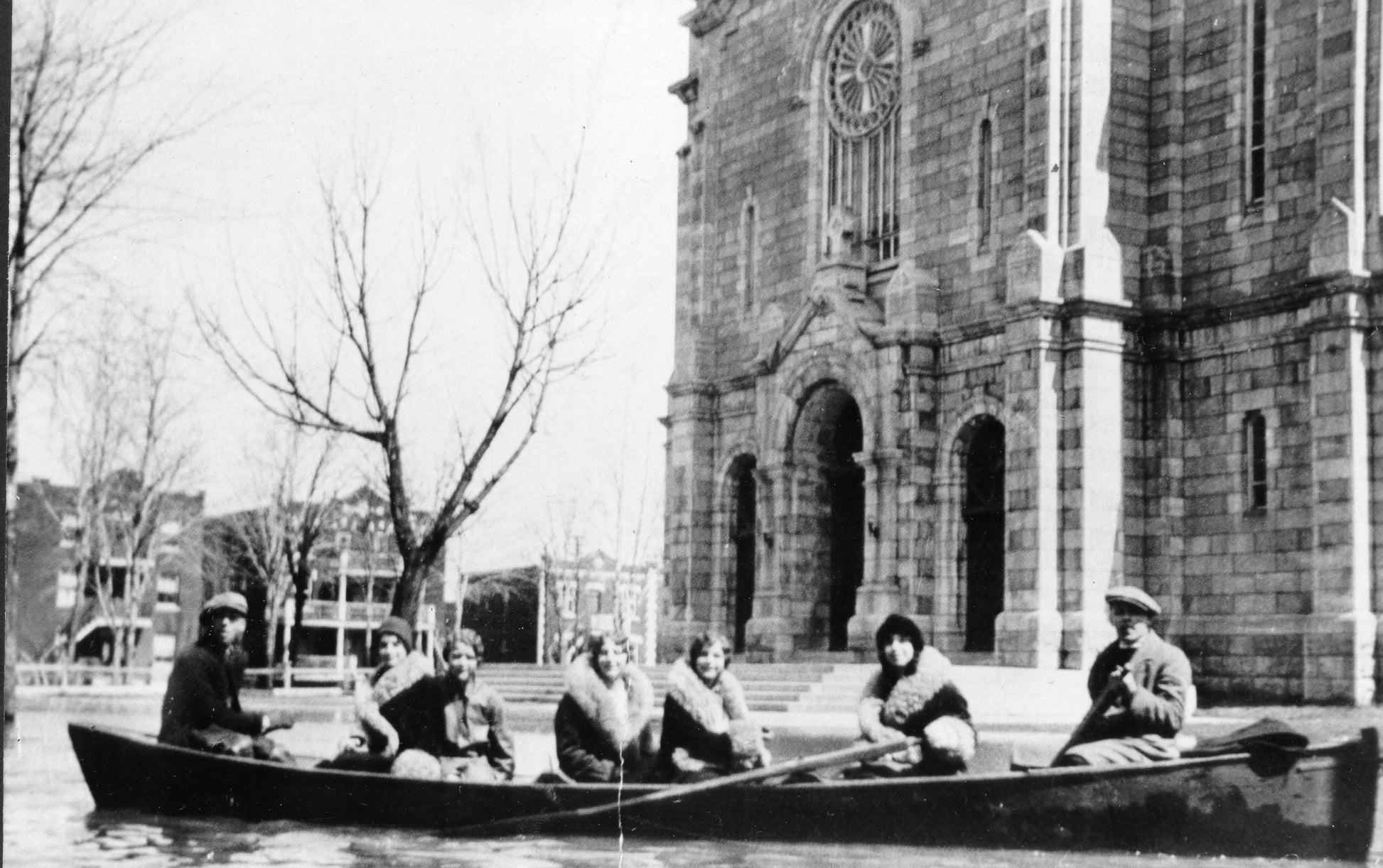 Groupe de personnes dans une chaloupe devant l'église St-François d'Assise de la Longue-Pointe lors de l'inondation du printemps de 1928.