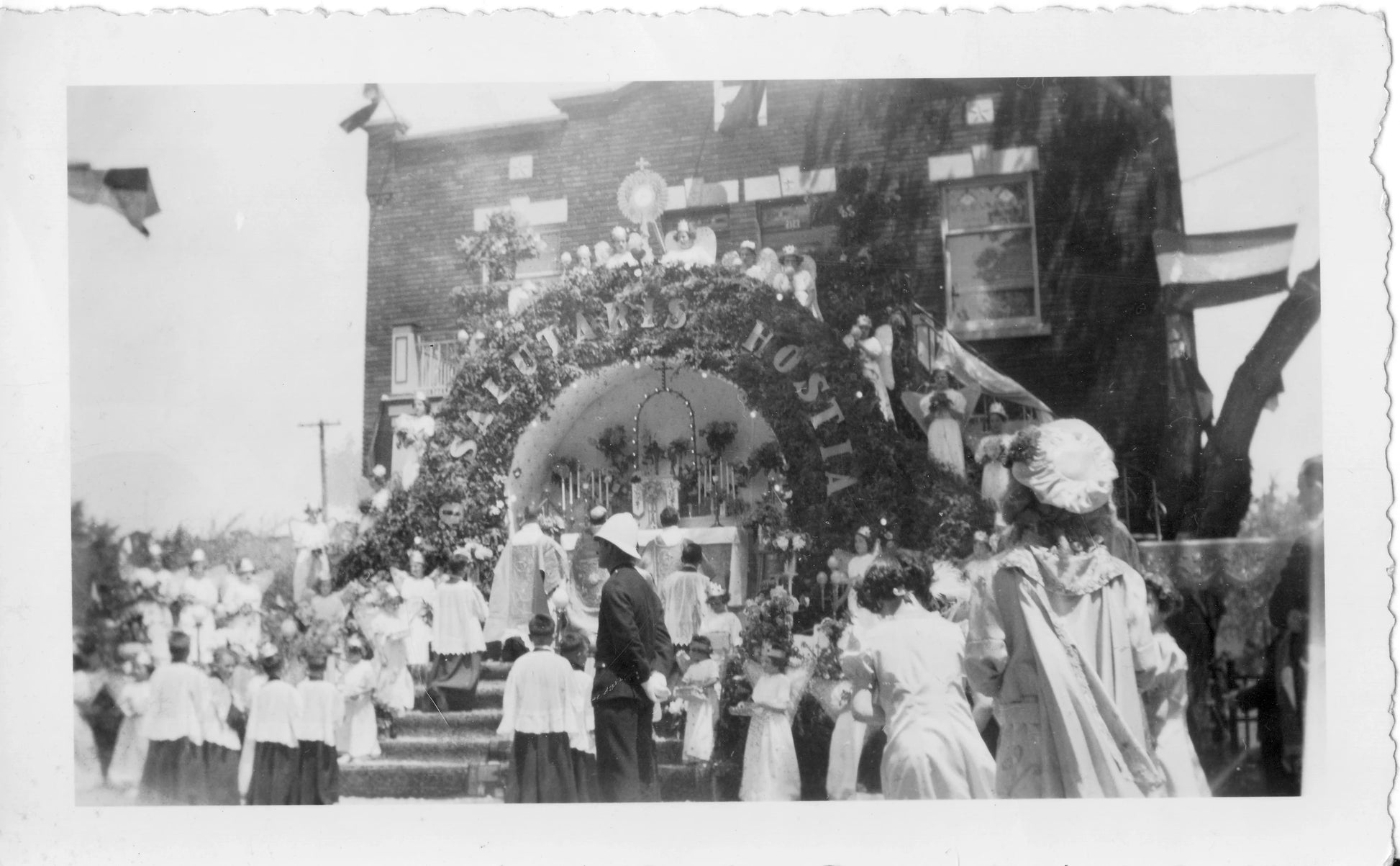 Reposoir rue Lebrun coin Tellier chez M. Leonidas Côté. Un policier porte un casque protocolaire colonial et la bannière fleurie se lit "O Salutaris Hostia".