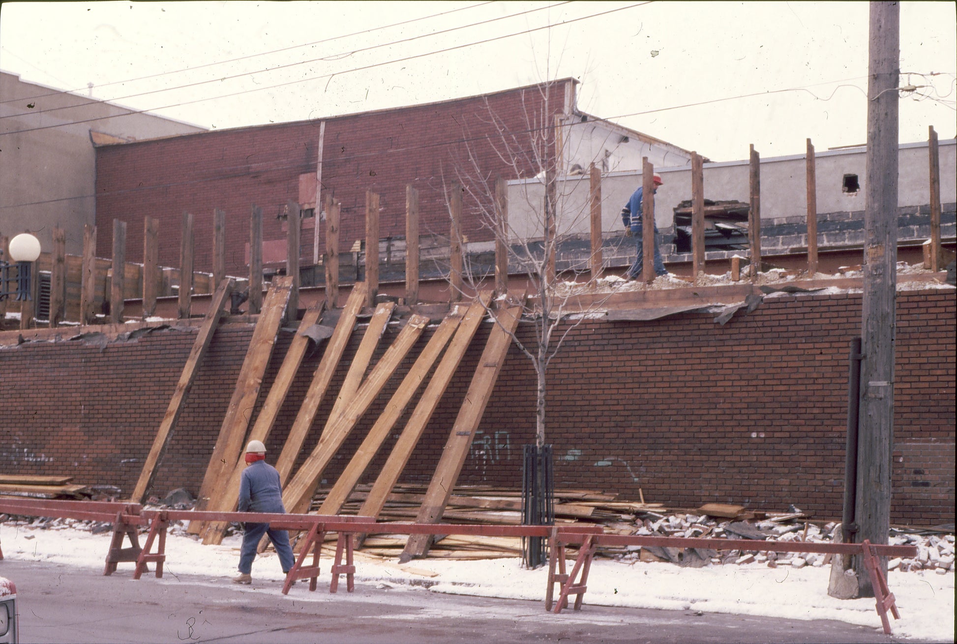 Démolition de H-B Brunelle. Ouvriers à l'oeuvre près de la ruelle au sud de Adam.