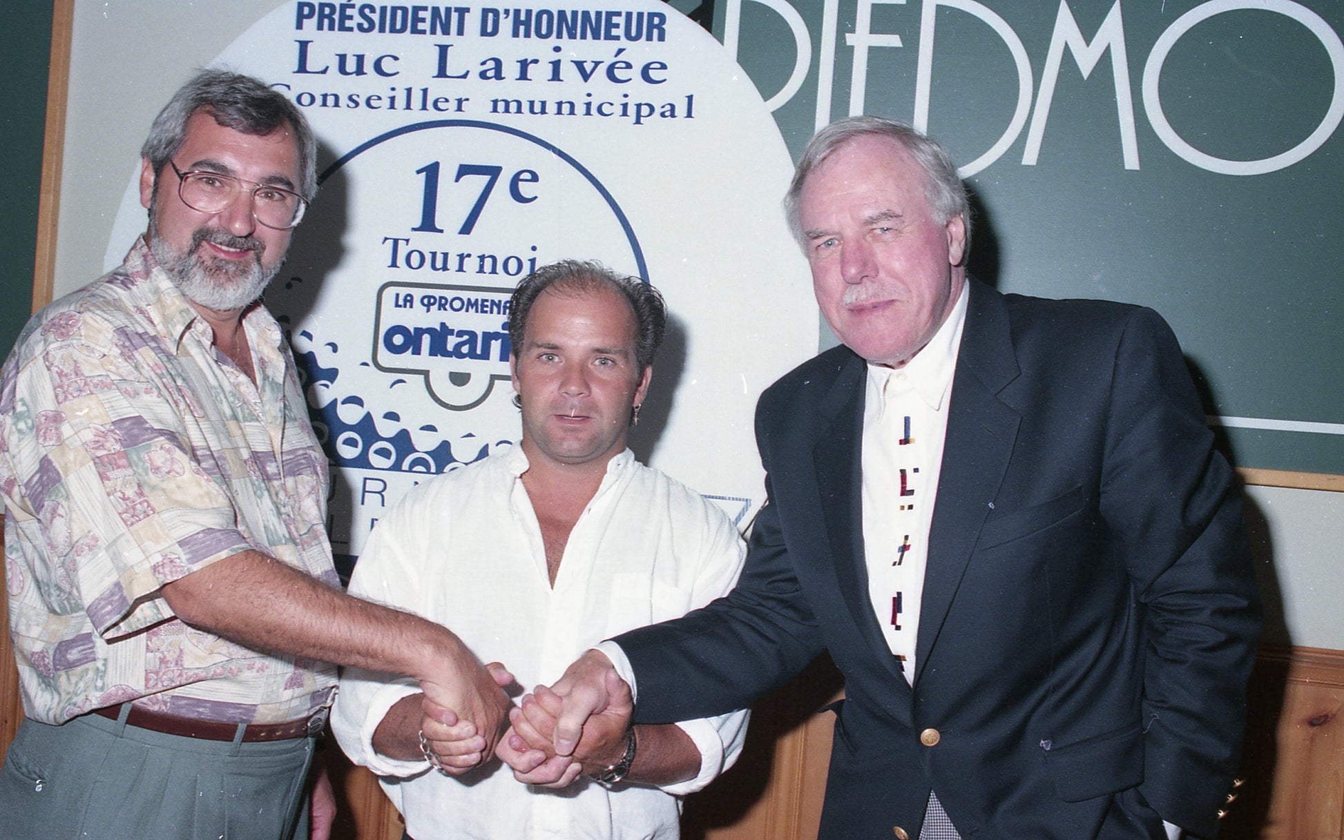 Le 9 août dernier a eu lieu la 17e édition du tournoi de golf de la Promenade Ontario; À cette occasion, Jean-Pierre Payette, de la Régie des installations olympiques, et Luc Larivée, président d'honneur du tournoi et conseiller municipal, félicitent Serge Hamel, de la Boucherie Beaubien, qui a remporté une loge pour 16 personnes pour assister à un match des Expos.