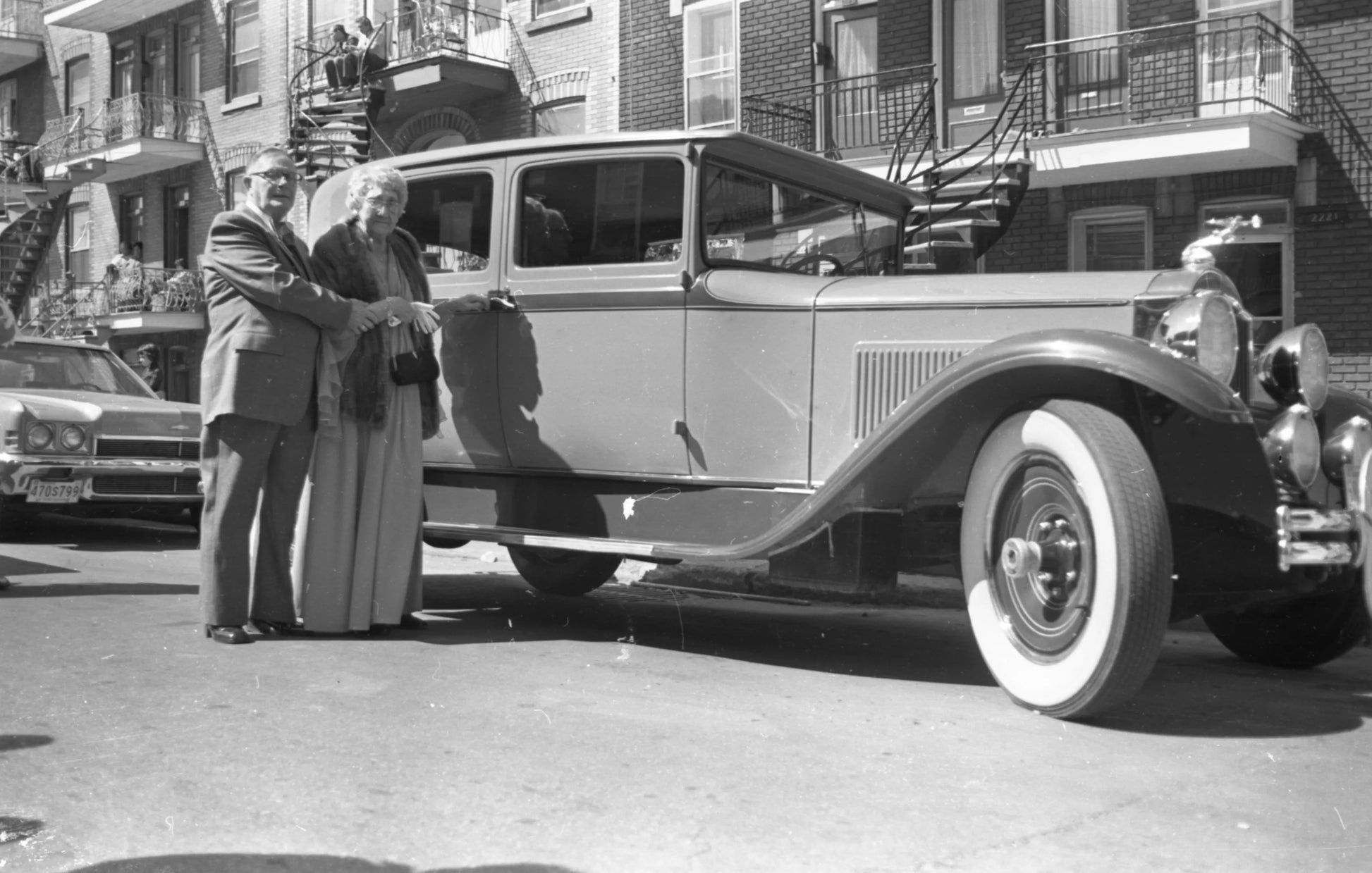 M. et Mme Zéphyrin Vendette dans une voiture d'époque vont fêter leur 60e anniversaire de mariage, 1977