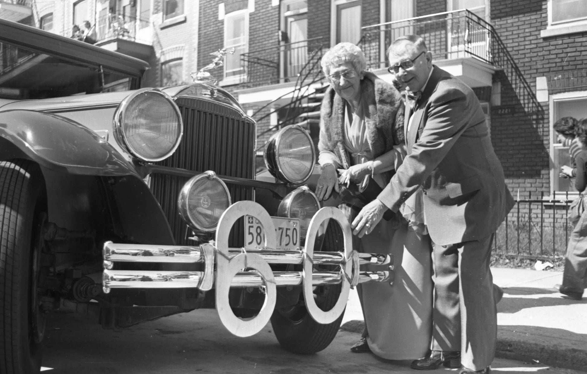M. et Mme Zéphyrin Vendette dans une voiture d'époque vont fêter leur 60e anniversaire de mariage, 1977