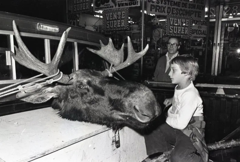 Jeune garçon devant une tête d'orignal, en face du Rossy's rue Masson 1978