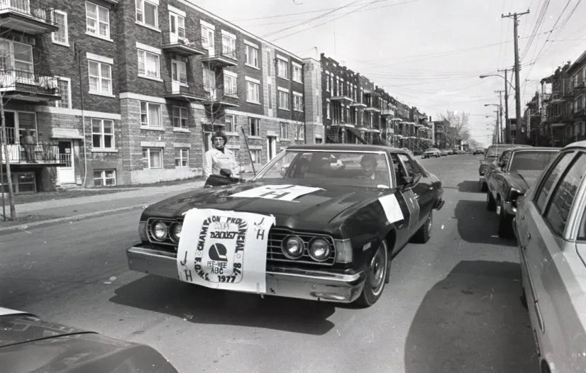 défilé de la victoire hockey peewee Jeunes sportifs Hochelaga. Départ en face de leur nouveau local. 1978