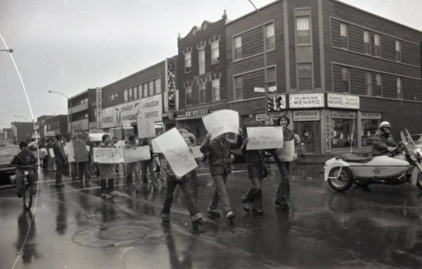 manifestations par des enfants rue Ontario coin Joliette contre la fermeture de l'arèna Préfontaine (Francis Bouillon) 1977-1978