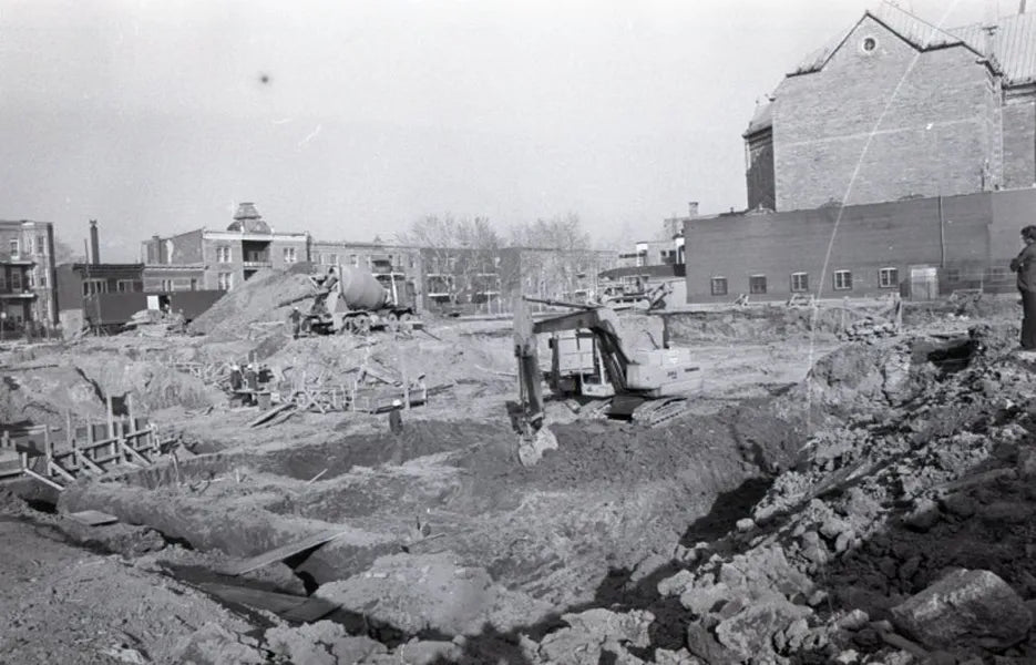 Début de construction derrière l'église Très-Saint-Nom-de-Jésus suite à la démolition de l'école au coin de Desjardins et Lafontaine 1980