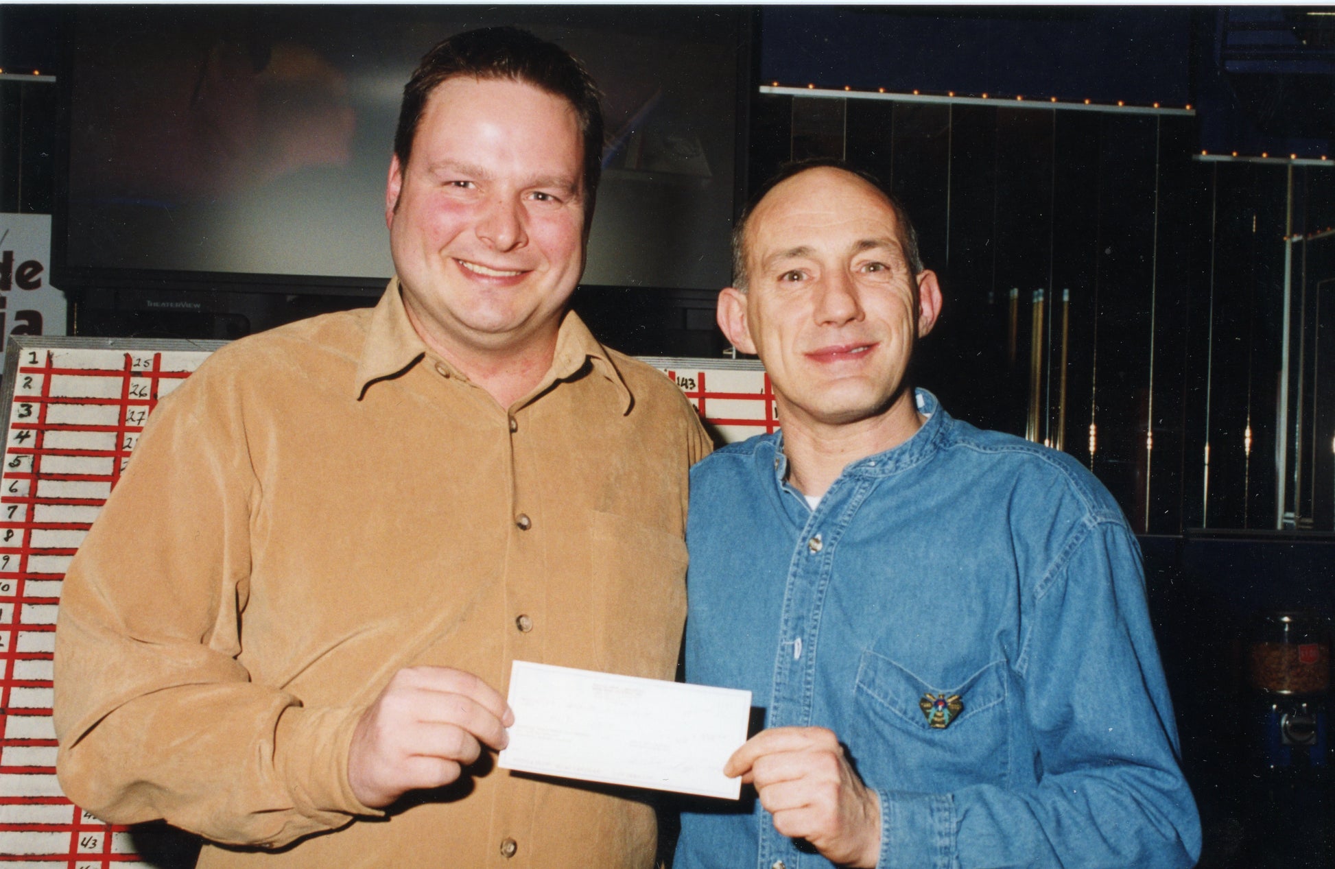 Le proriétaire de L'imprévue, Denis Sylvestre remet un chèque de 800$ au Président du Club optimiste Maisonneuve.