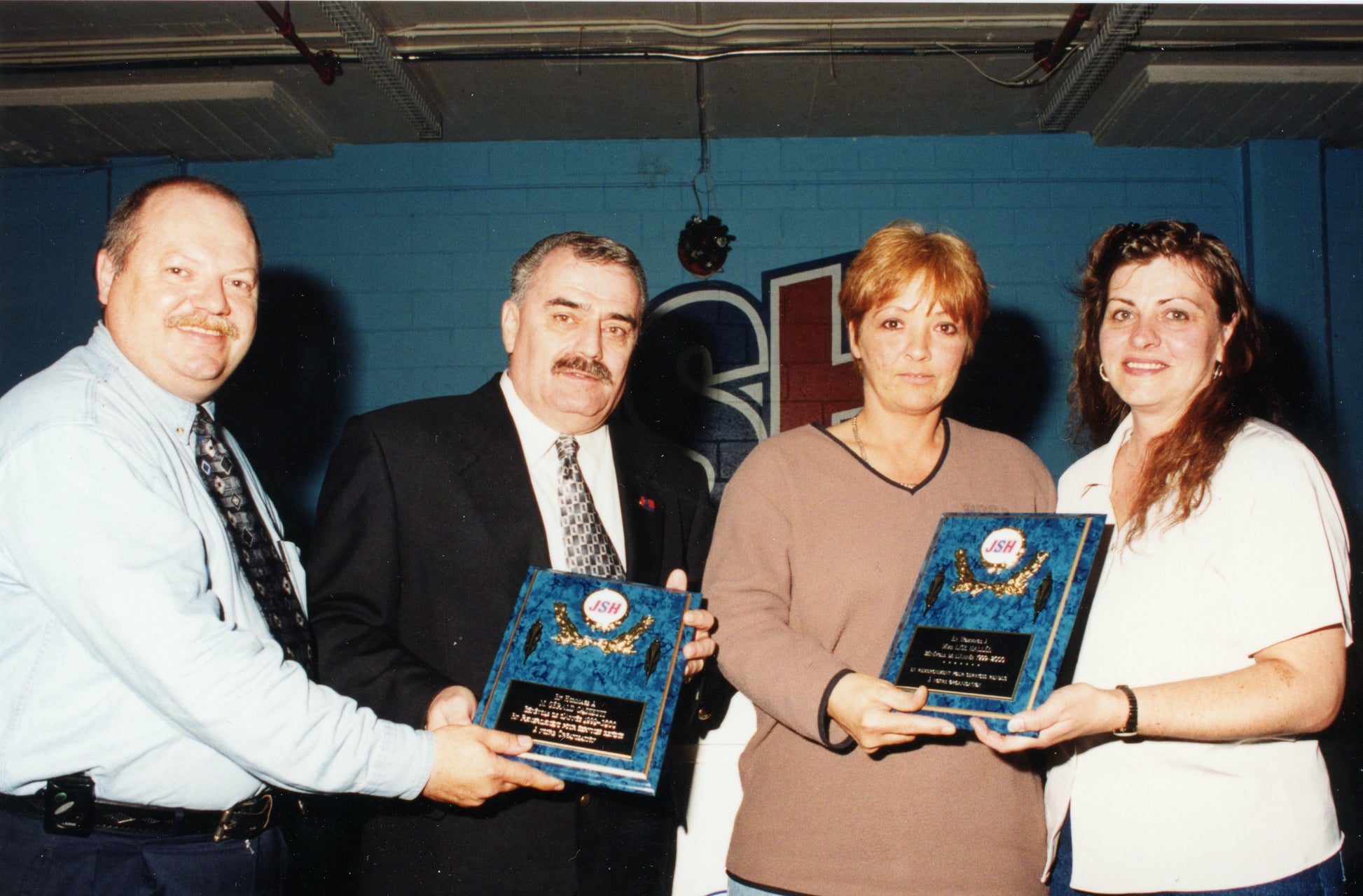Des plaques commémoratives sont remises par Robert Demers et Johanne Carpentier aux bénévoles de l'année à JSH, Gérard Cassetti et Lise Hallée. NdE, 31 mai 2000, p.19.