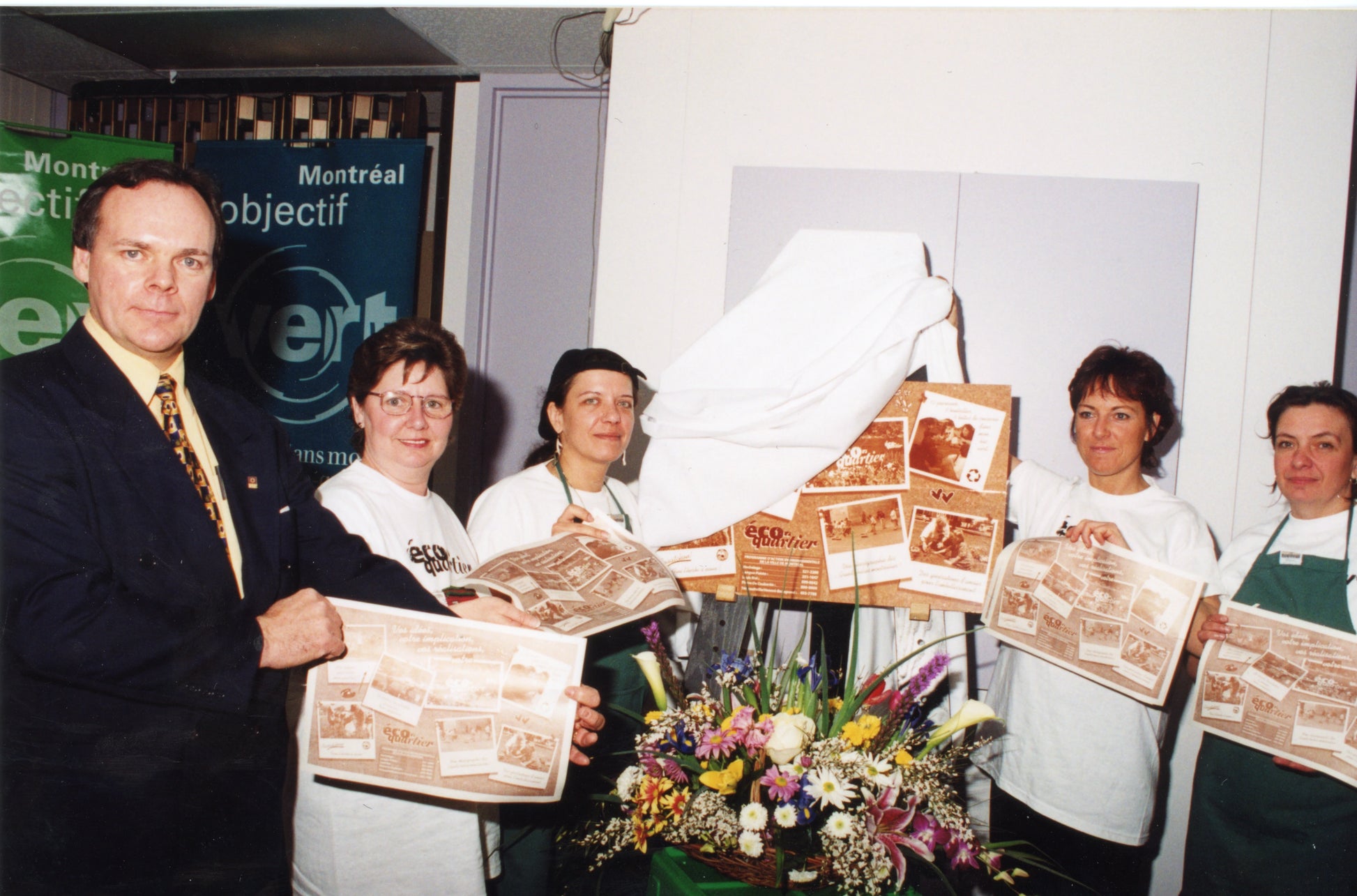 Les Éco-quartier de Mercier et Hochelaga lancent leur nouveau napperon de sensibilisation. Ignacio Duque, coordonnateur de l'Éco-quartier Louis-Riel, Hélène Boucher de l'Éco-quartier Hochelaga, Carmen Pelletier de l'Éco-quartier Longue-Pointe, Lorrain Leduc de l'Éco-quartier Tétraulville\Honoré-Beaugrand, Nicole Pouliot de l'Éco-quartier Pierre-de Coubertin, Normand Boucher de la SAQ, Hélène Boisvert et Jacques Tremblay de la Ville de Montréal posent avec leur nouveau napperon.