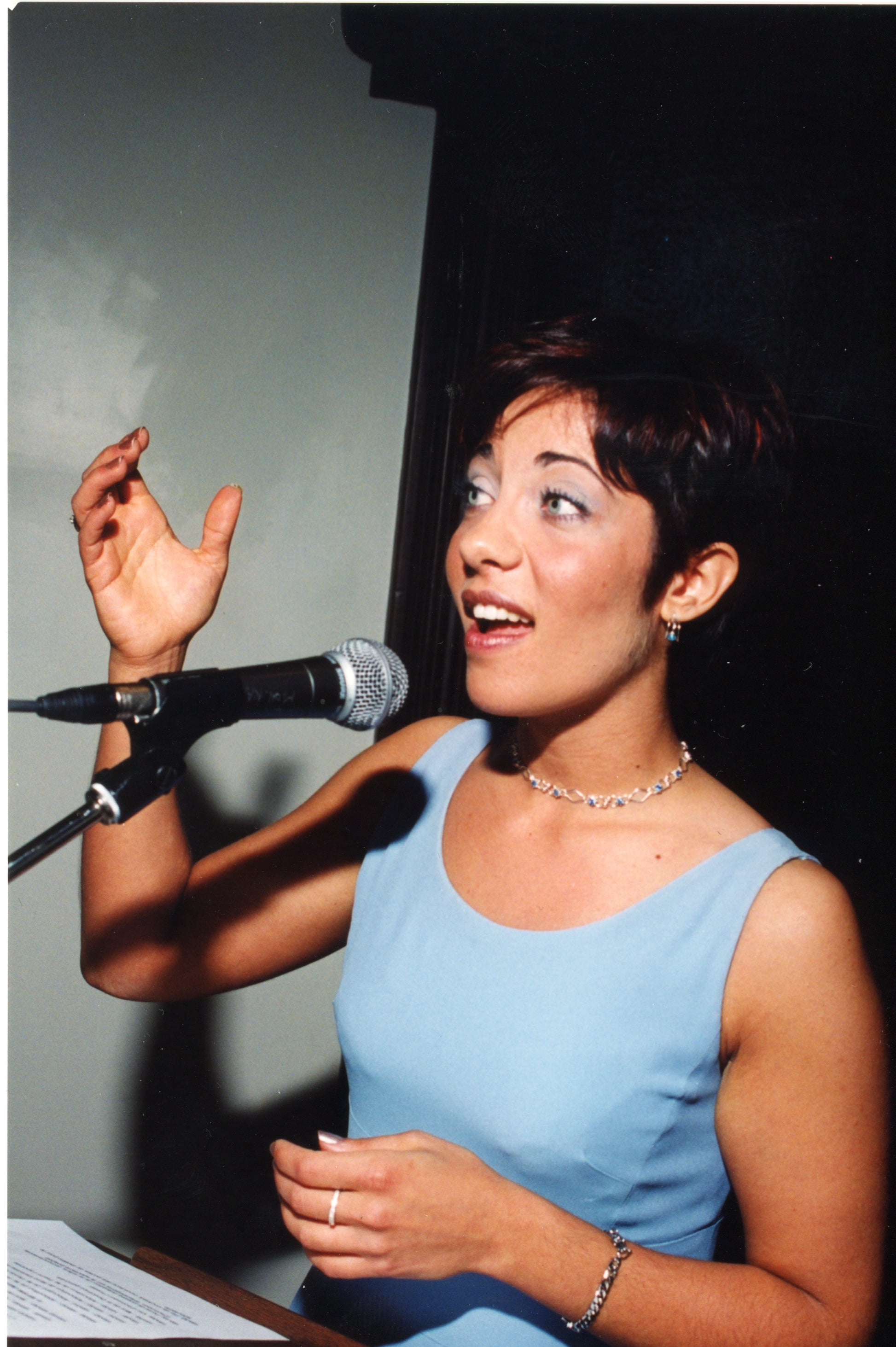 La directrice générale de la maison des femmes sourdes, Martine Gagnon, s'adresse au public à sa soirée bénéfice : Un spectacle Gospel. Photo non publiée, voir article NdE, 21 juin 2000, p.5.