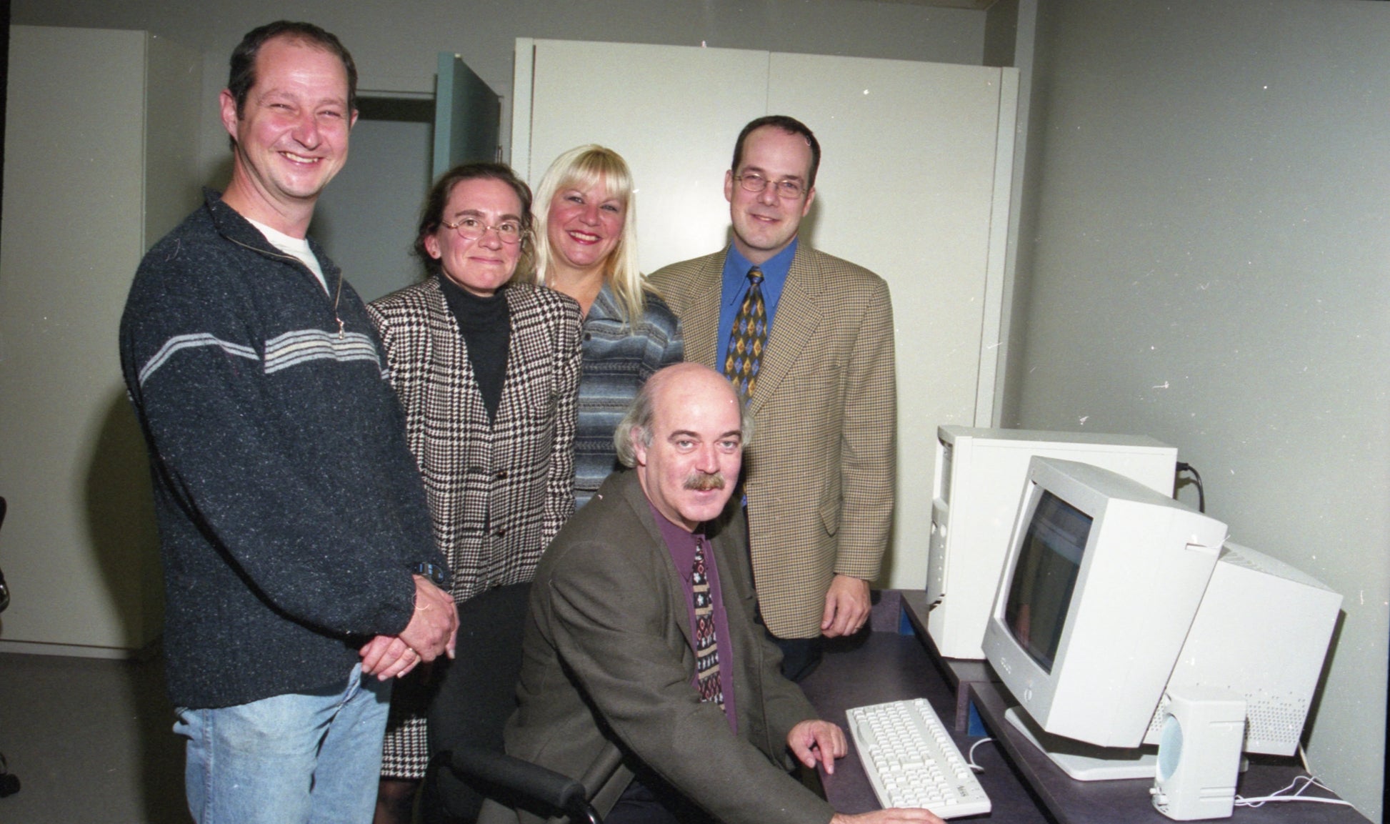 L'@venue Centre Internet Communautaire. Un nouveau centre d'accès à Internet voit le jour à la CDEST. Yves Gagnon (Directeur Général de l'Avenue), Sophie Legault (Responsable du comité techonologue de la CDEST), Linda Roy (responsable du l'informatique de la CDEST), Maitre Luc Richard (Président de la CDEST), Laurent Blanchard (Directeur général de la CDEST). NdE, 25 octobre 2000, p.6.