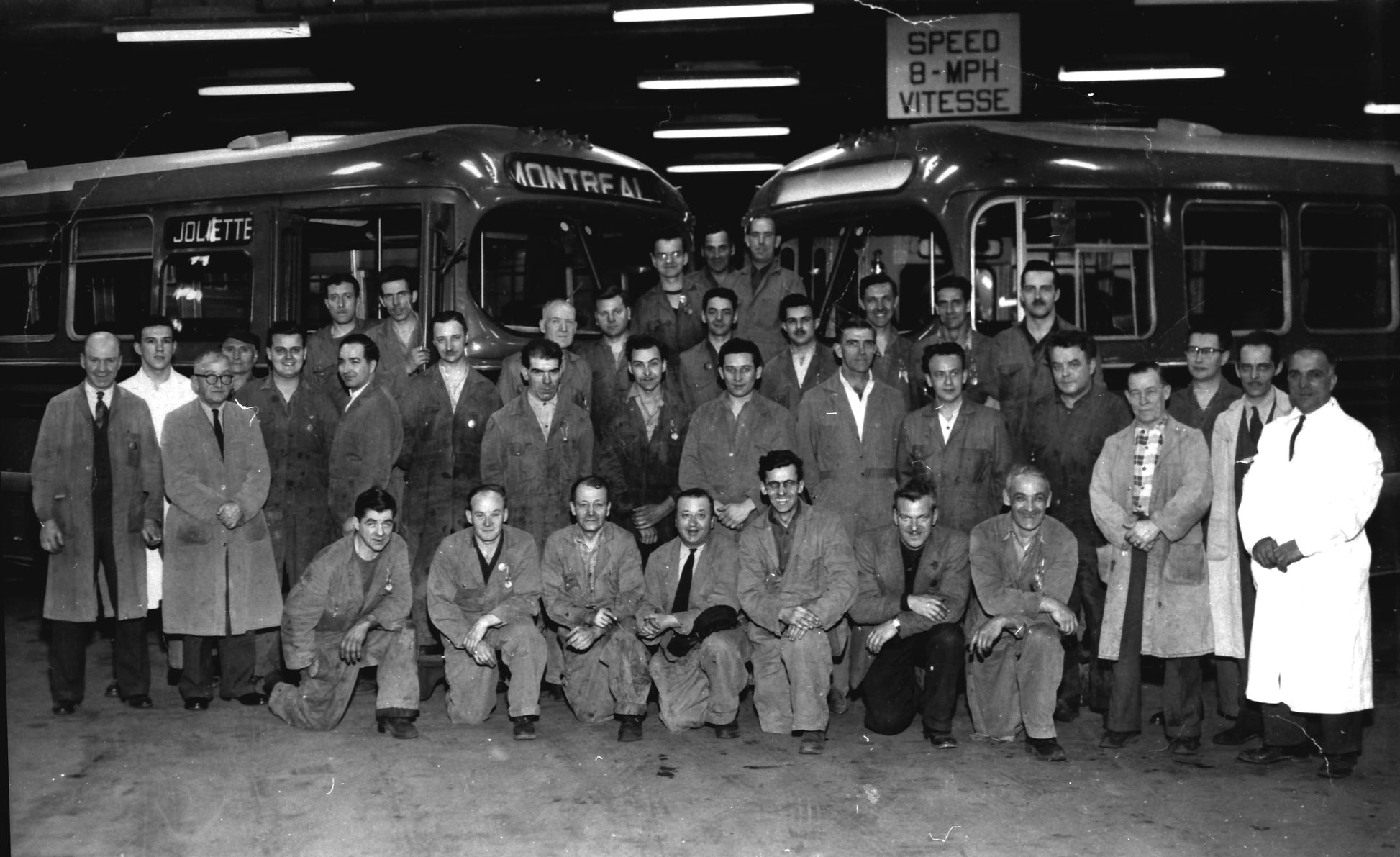 Groupe d'ouvriers représentant le service de réparation de nuit de la compagnie Provincial Transport à Montréal, regroupé devant deux autobus.