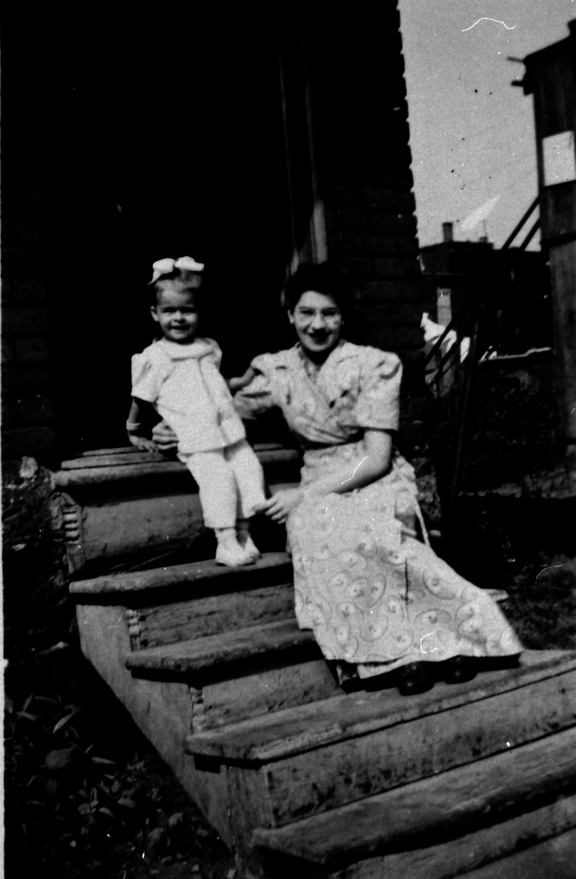 La jeune Micheline Morrissette et Irène Bergeron sur les marches extérieures du domicile de la famille Bergeron.