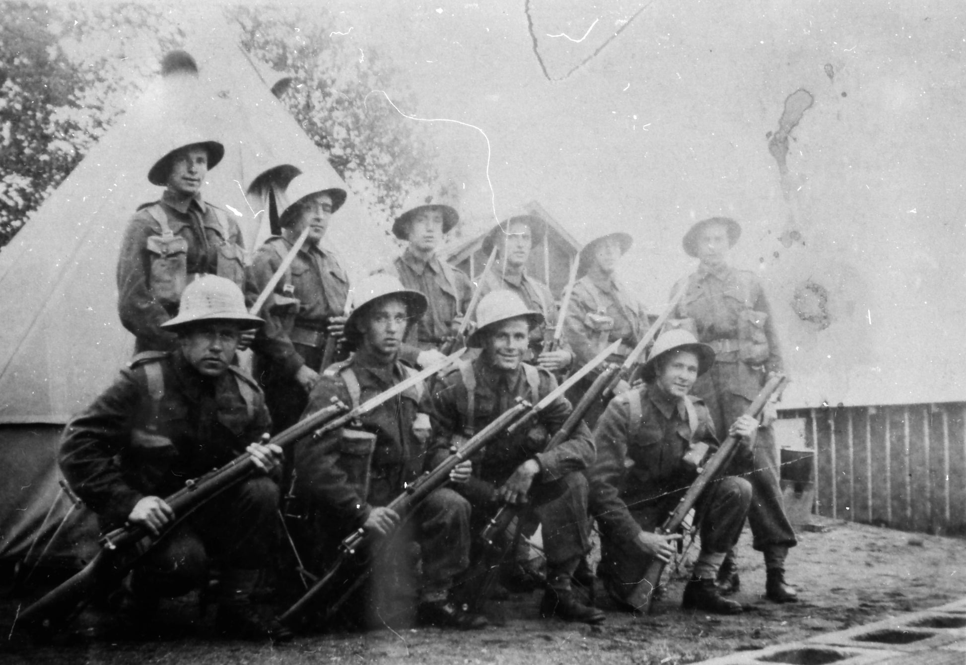 Groupe de soldats devant une tente, en uniformes et armes au poing, à la base militaire de Valcartier.