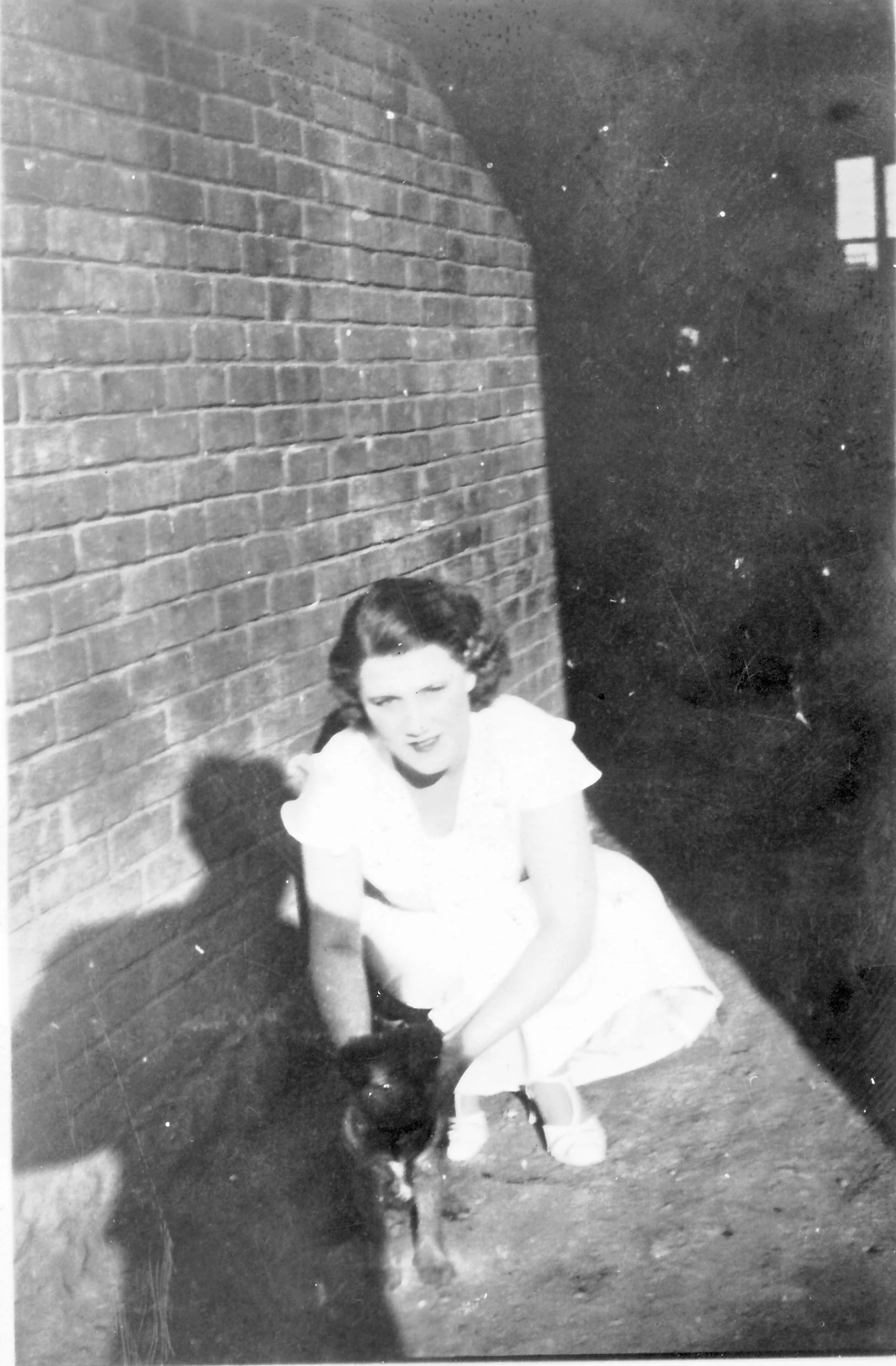 Femme vêtue d'une robe assise à côté d'un mur de briques.