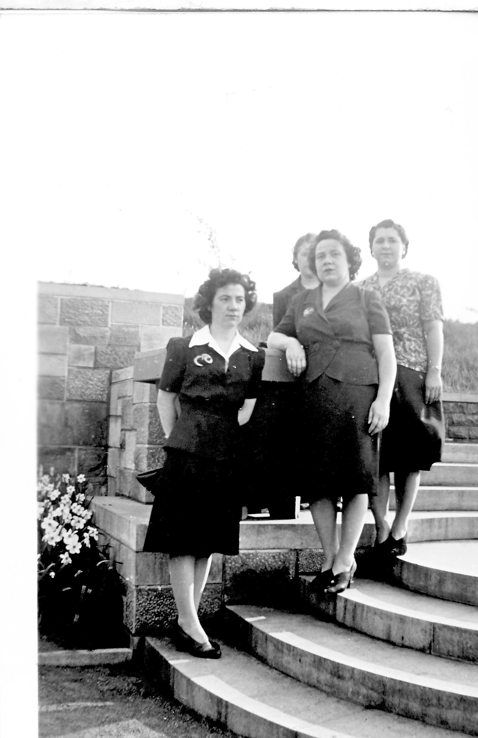 Quatre femmes, debout, à côté d'un muret de briques, au Jardin botanique.