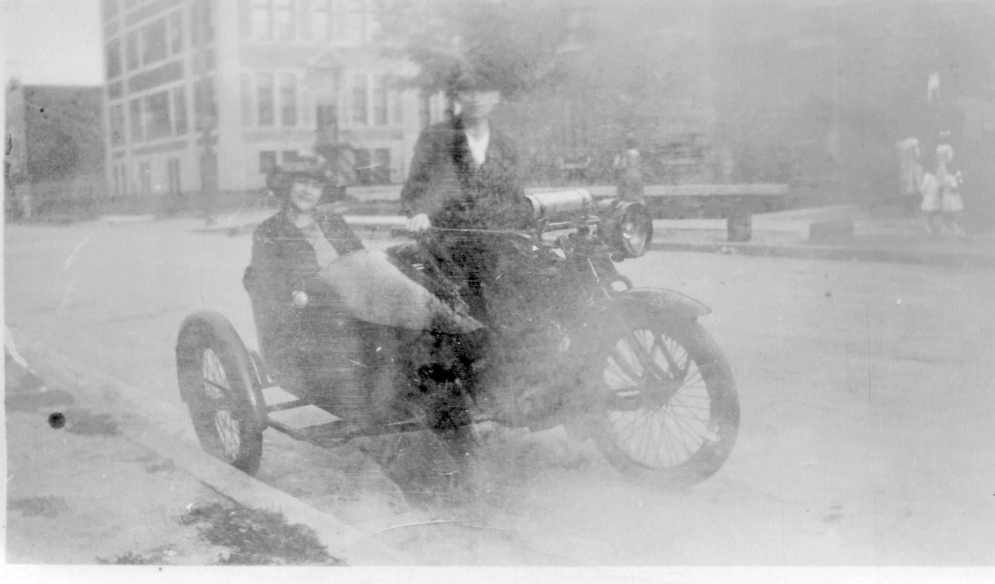 Motocyclette avec sidecar sur la rue Théodore au nord de Lafontaine. En arriére-plan, l'école St-Clément.
