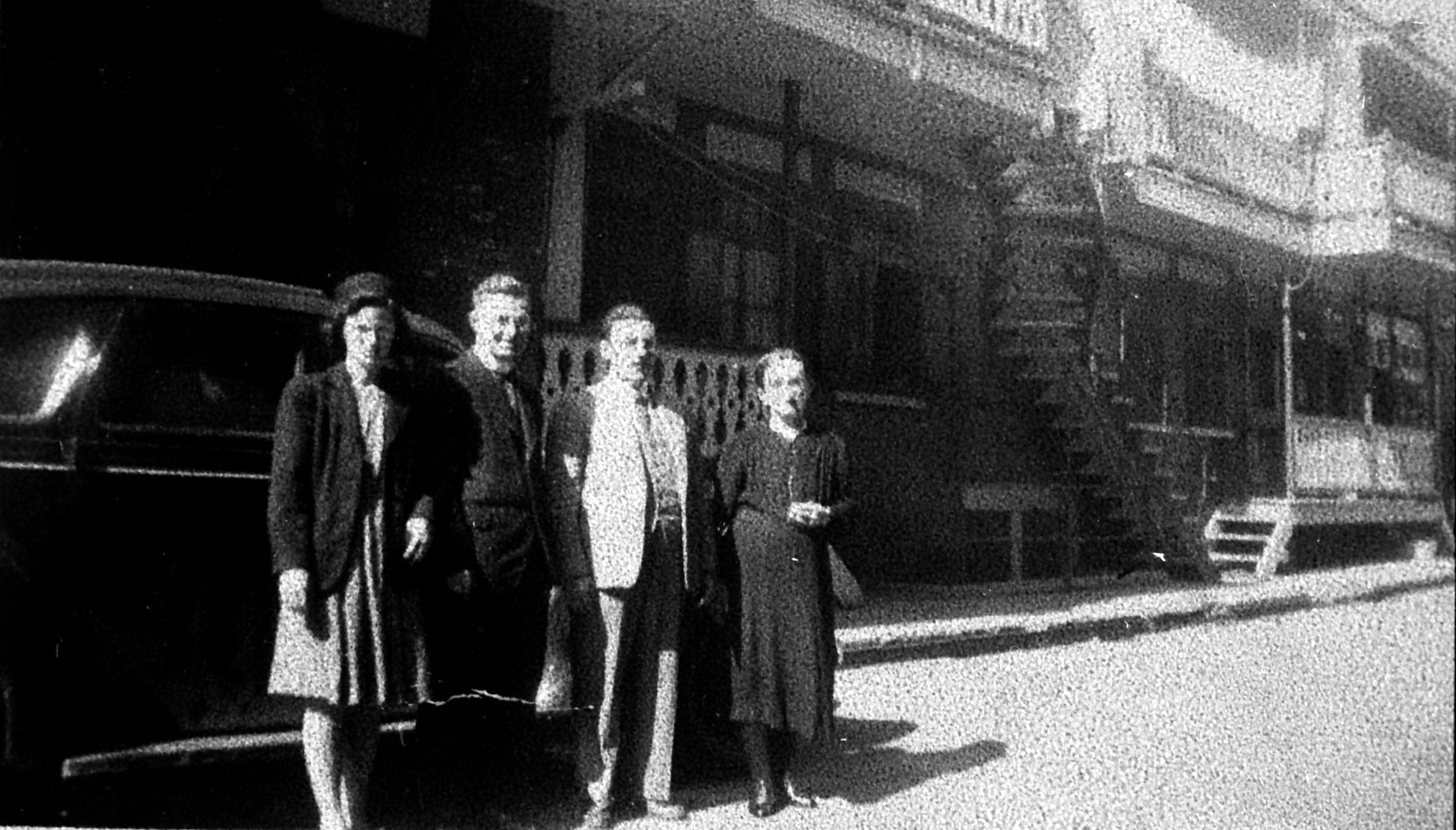 Cécile Casgrain et trois autres personnes debout devant une automobile et des façades de maisons à logement de la rue Delorme dans le quartier Sainte-Marie.