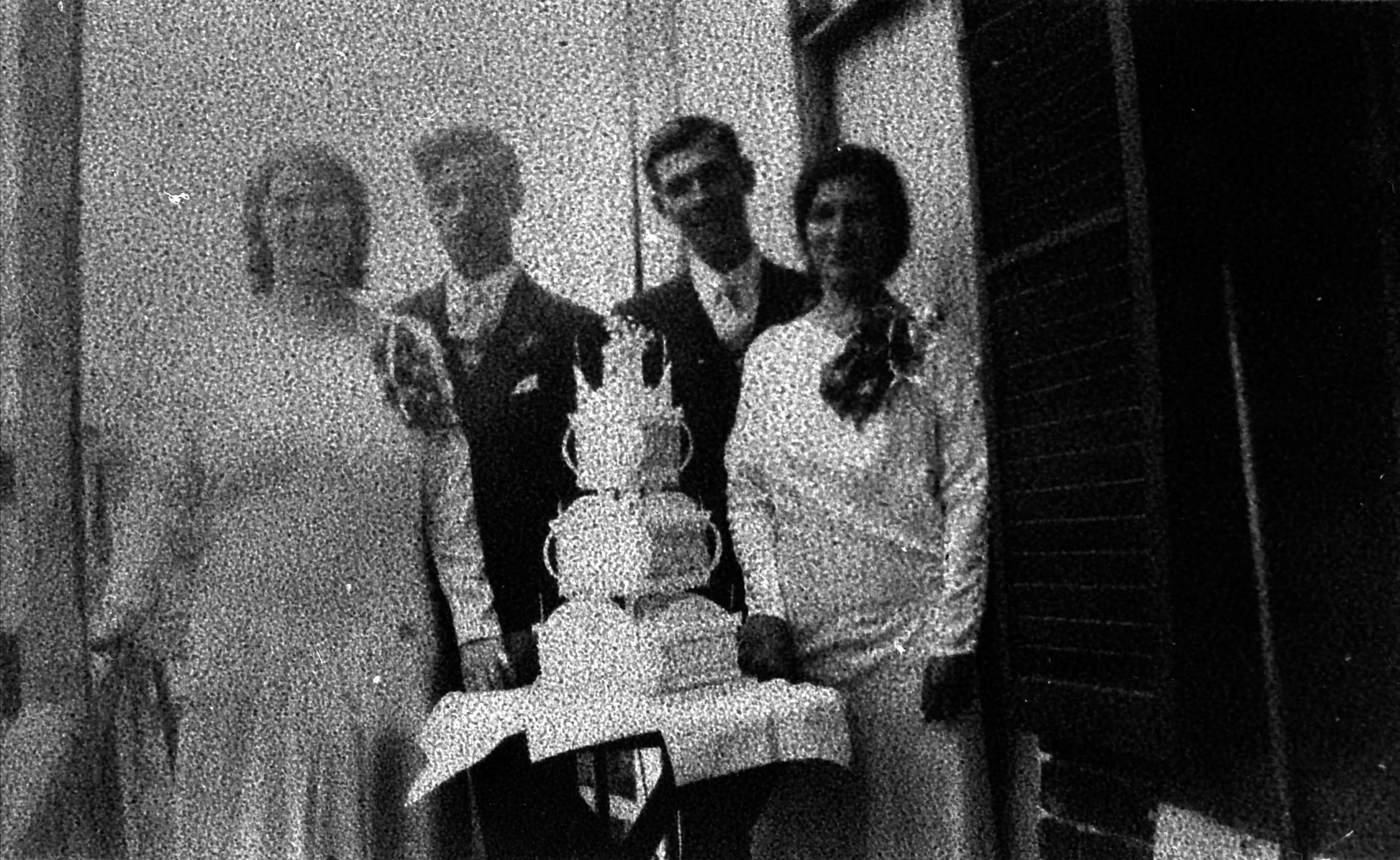 Alice Soucy et Arthur Tremblay le jour de leur mariage, debout sur un balcon avec Jeanne Morency et Armand Soucy, devant le gâteau de noce.
