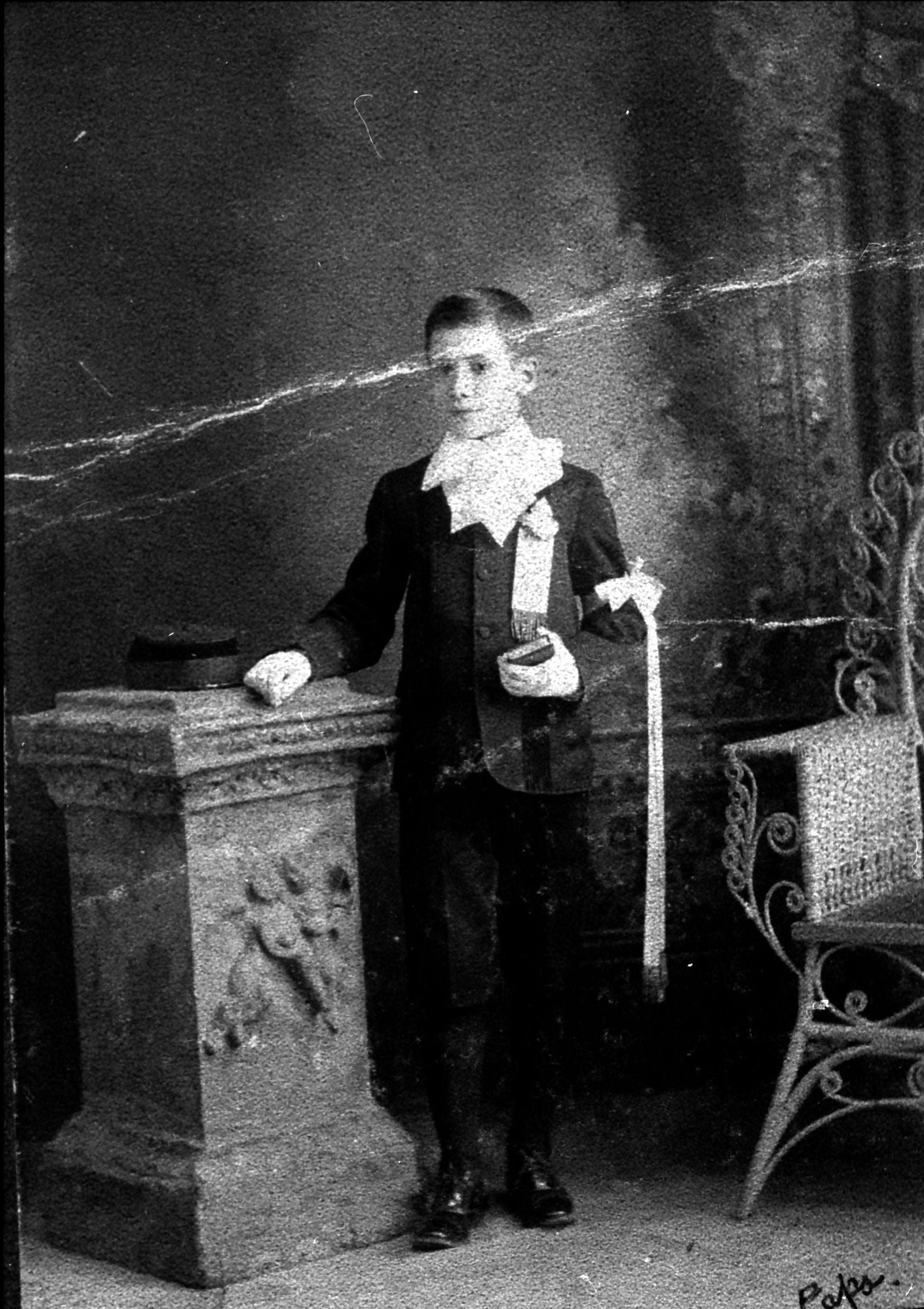 Le jeune Rosario Soucy, debout et accoté à une table, lors de sa première communion..