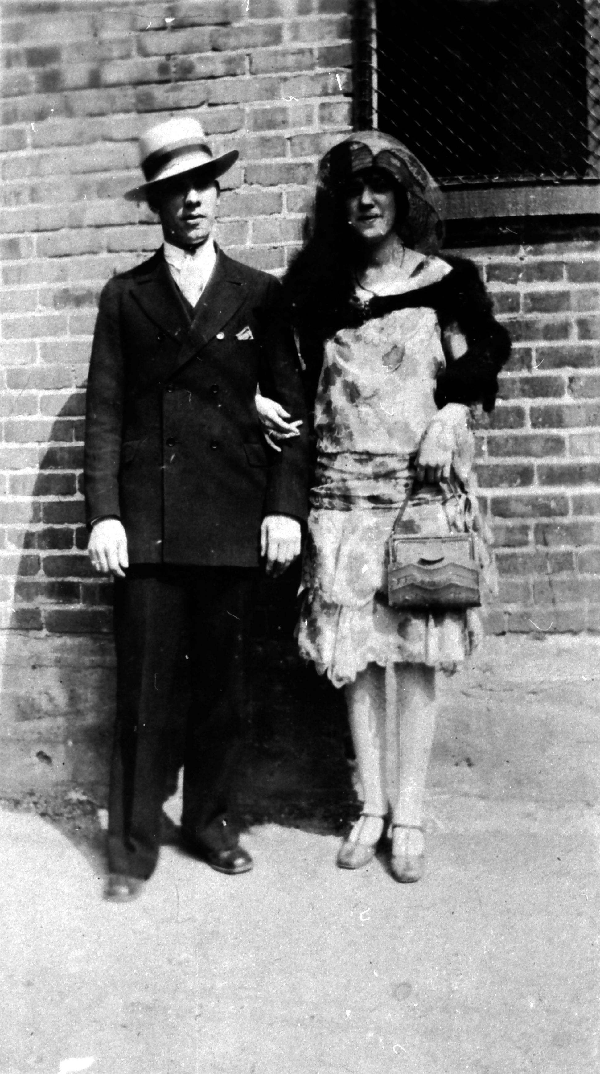 Jérémie Soucy, surnommé Lorenzo, et Rose-Alma, debout devant la façade d'un restaurant faisant face à l'école Nativité-de-la-Sainte-Vierge, située sur la rue Saint-Germain. 1925. Source: Don de René Soucy. Supp.: Nég. 35 mm n.b.