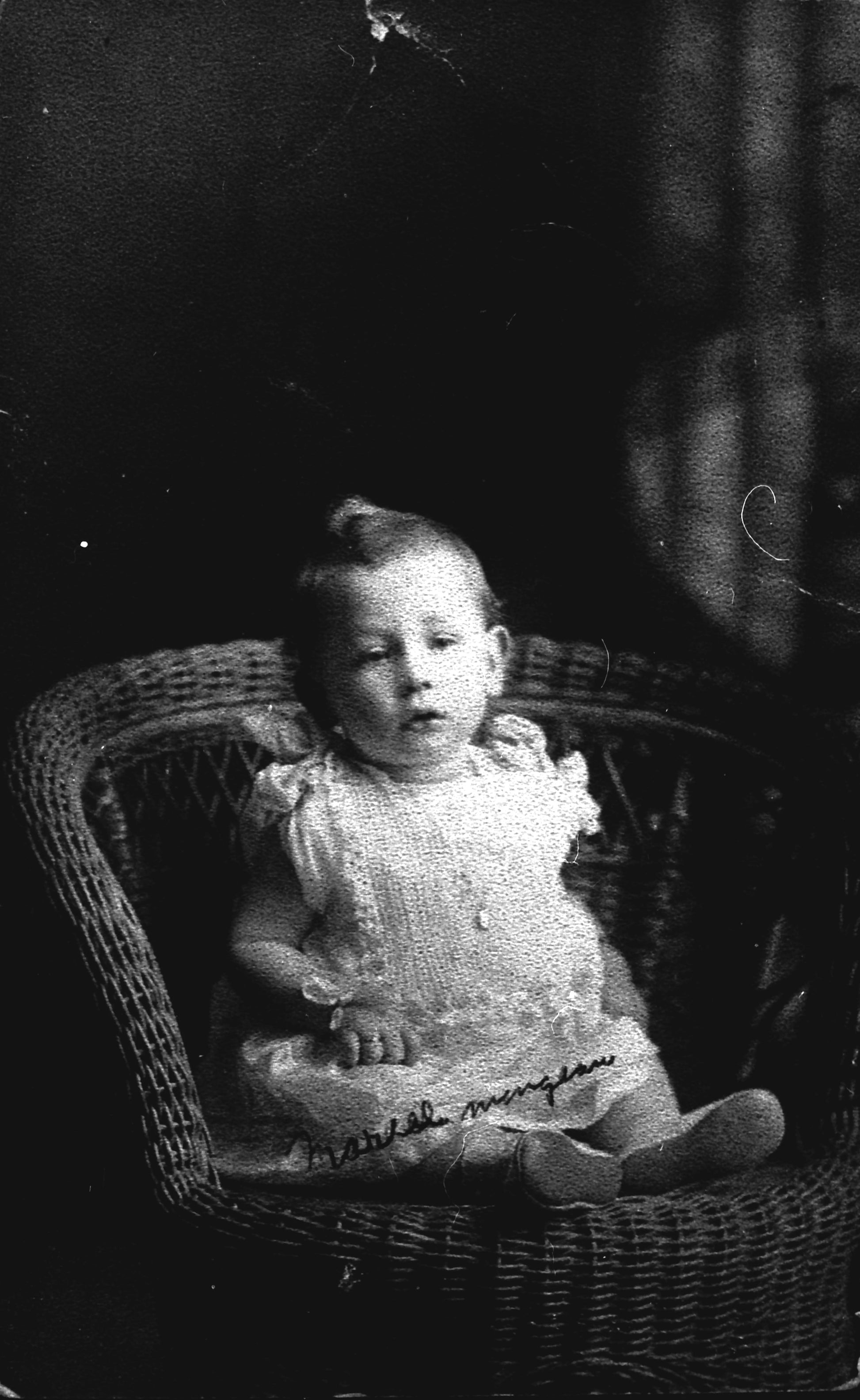 Le jeune Marcel Mongeau, bébé, assis sur une chaise en rotin. Charles Planthier, Photographe, 1825 rue Sainte-Catherine.