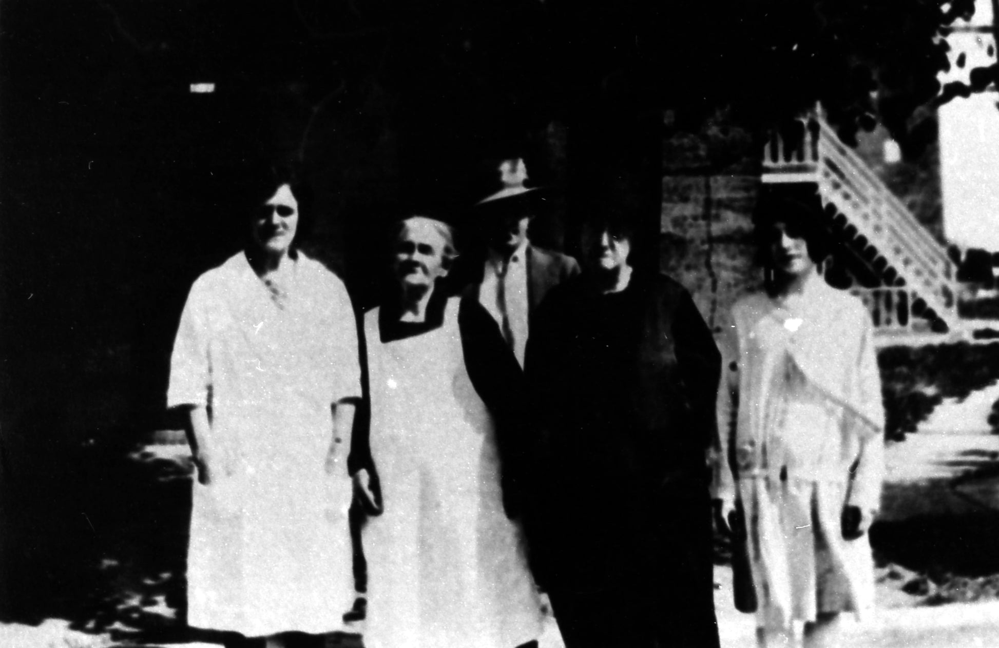 Cinq personnes, debout devant la façade d'une maison de la paroisse Notre-Dame-des-Victoires.
