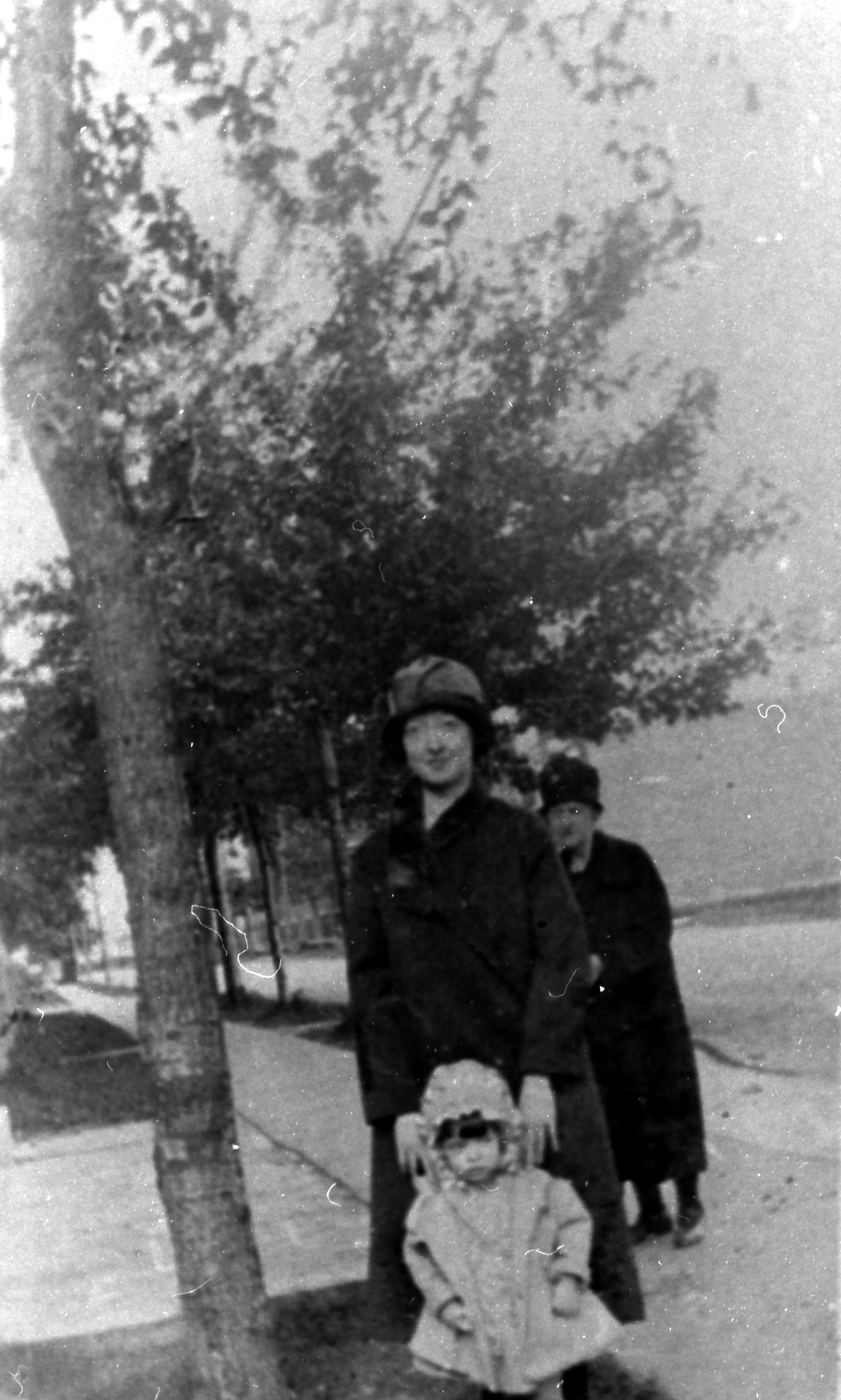 Véronica Corcoran debout tenant une fillette devant elle, sur un trottoir bordé d'arbres de la paroisse Notre-Dame-des-Victoires.