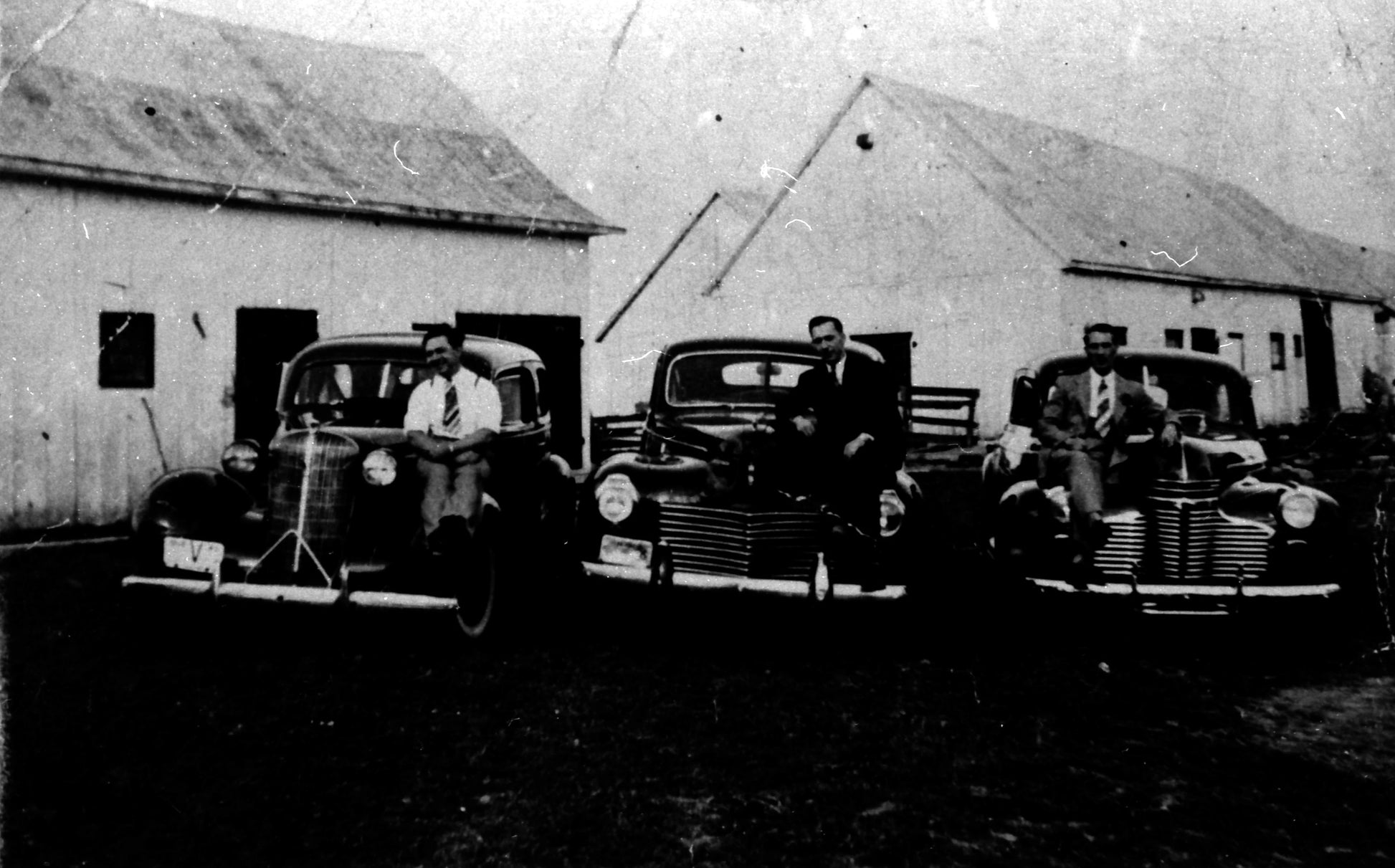 Les trois frères Bibeau assis sur les capots de leurs trois automobiles.