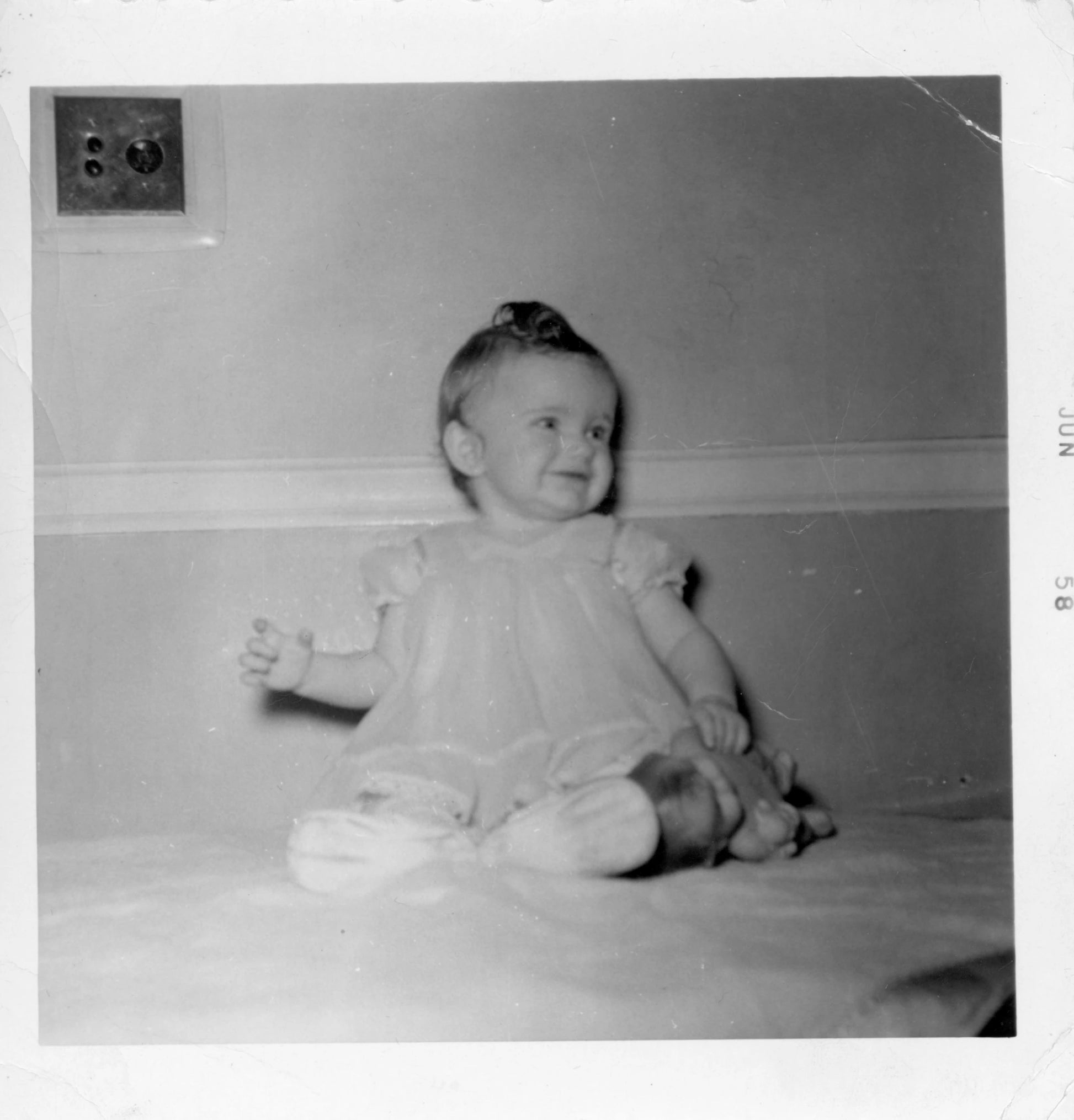 Johanne Berthiaume, 1 an, assise et souriante avec une poupée.