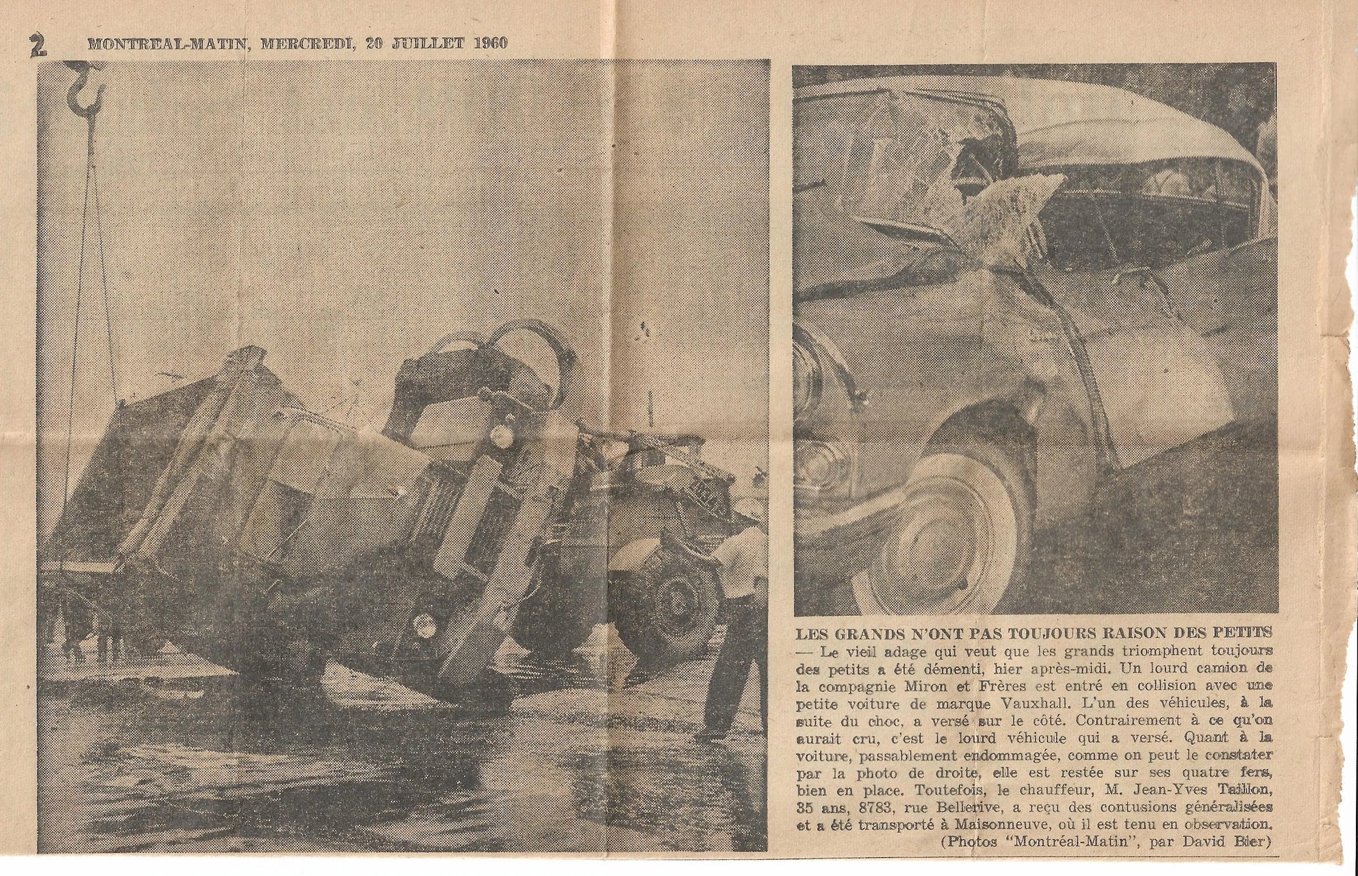 Accident de Jean-Yves Taillon rapporté dans dans le Montréal-Matin du 20 juillet 1960