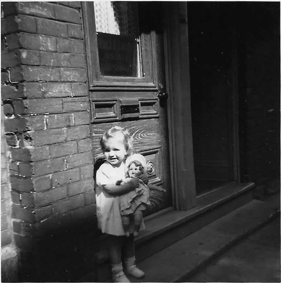 Pauline Carmel avec sa poupée devant la résidence familiale