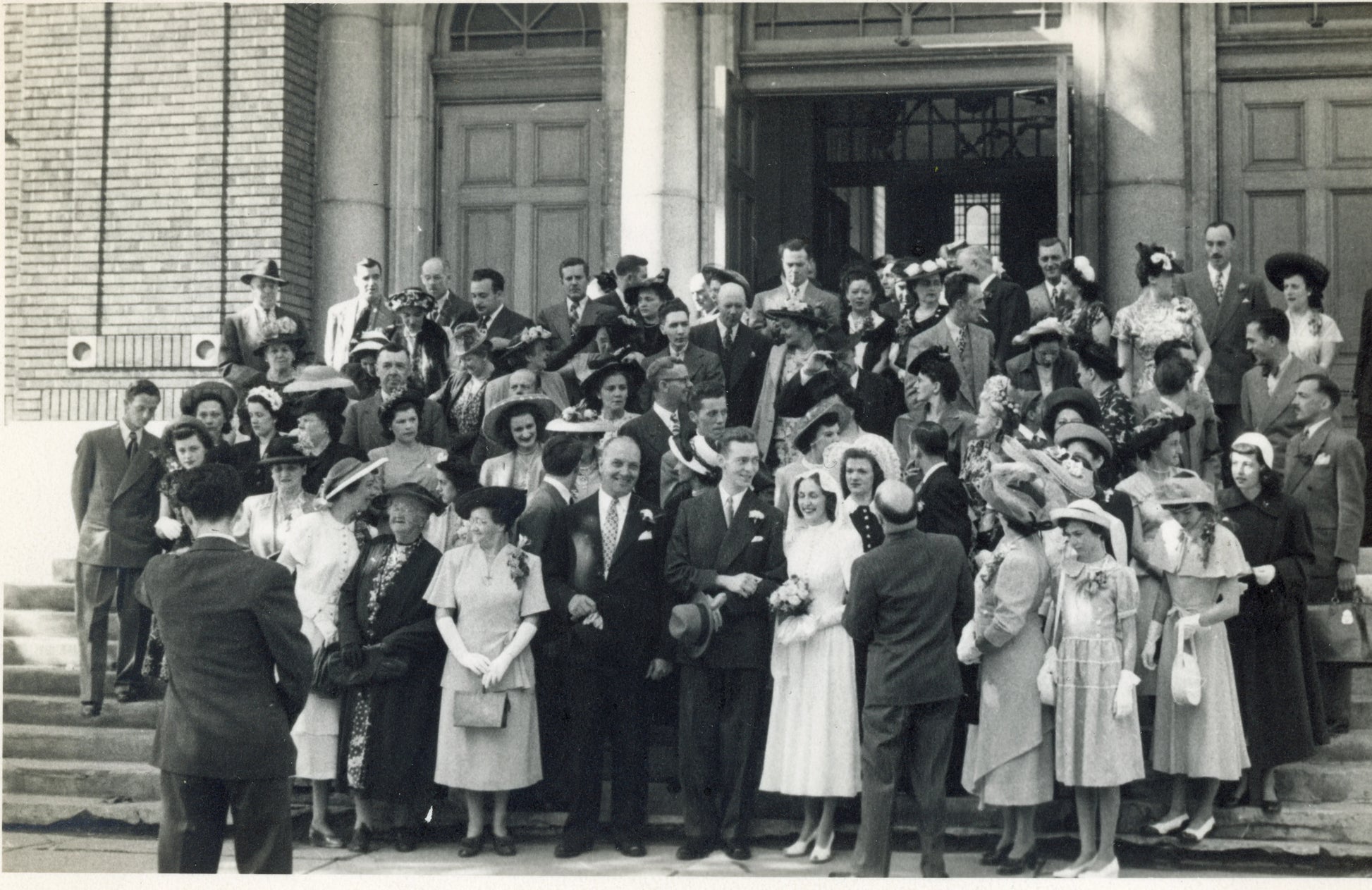 Une photo de mariage en 1948 devant l'église Notre-Dame-des-Victoires. On y voit le photographe.